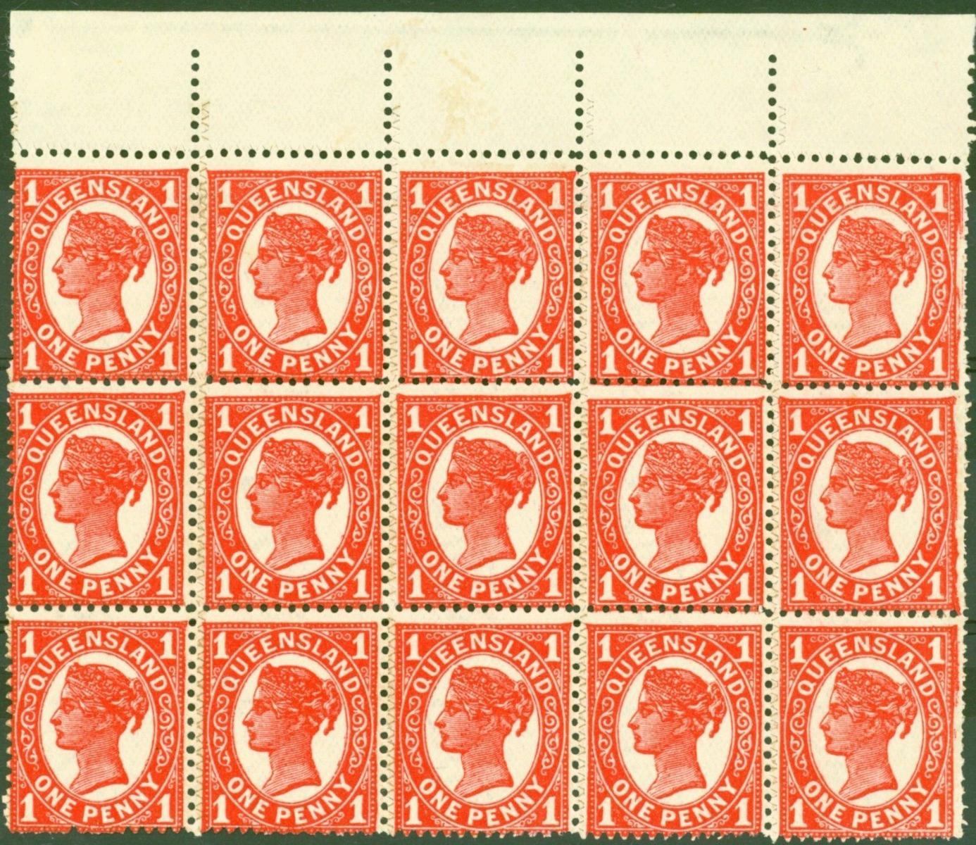 Queensland 1897 1d Vermilion ZigZag SG259(d) Plain Roulette x Perf VF MNH Block of 15