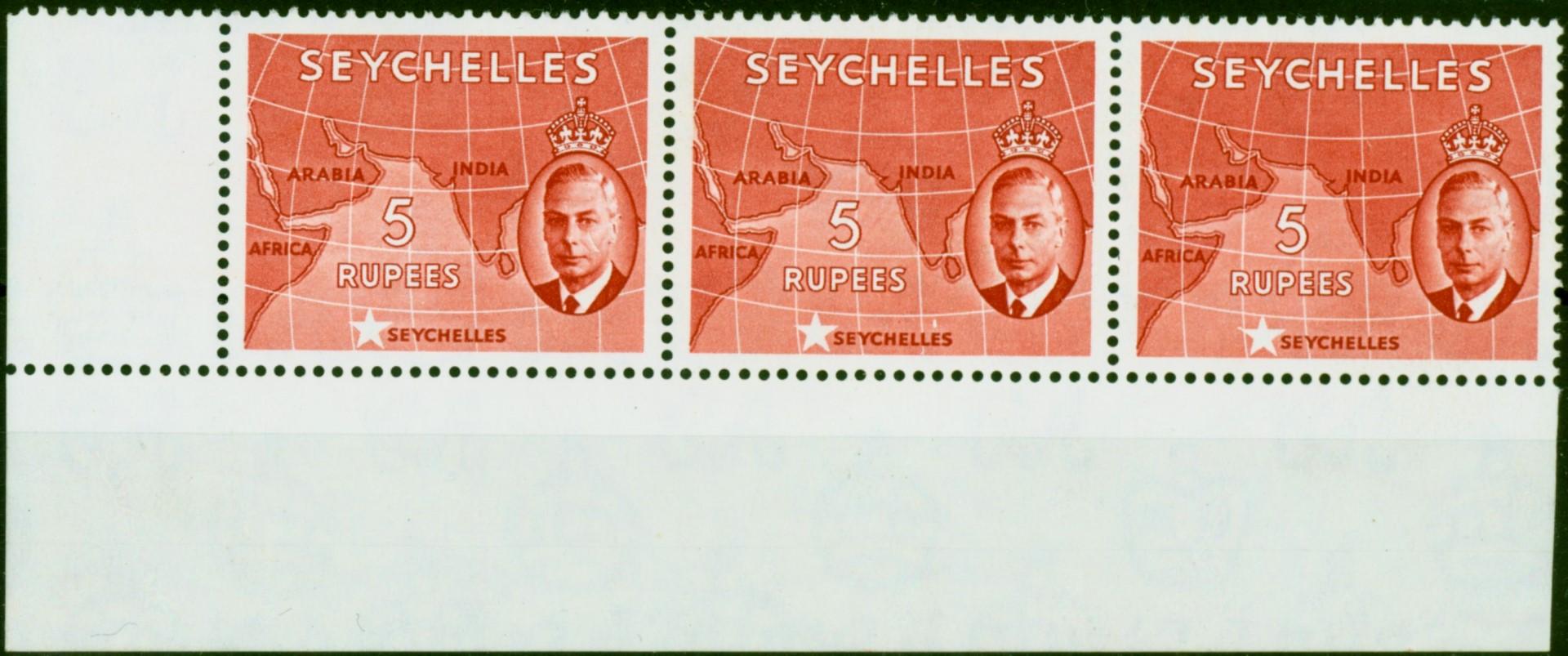 Seychelles 1952 5R Red SG171b 'Error St Edwards Crown' in a Superb MNH Strip of 3