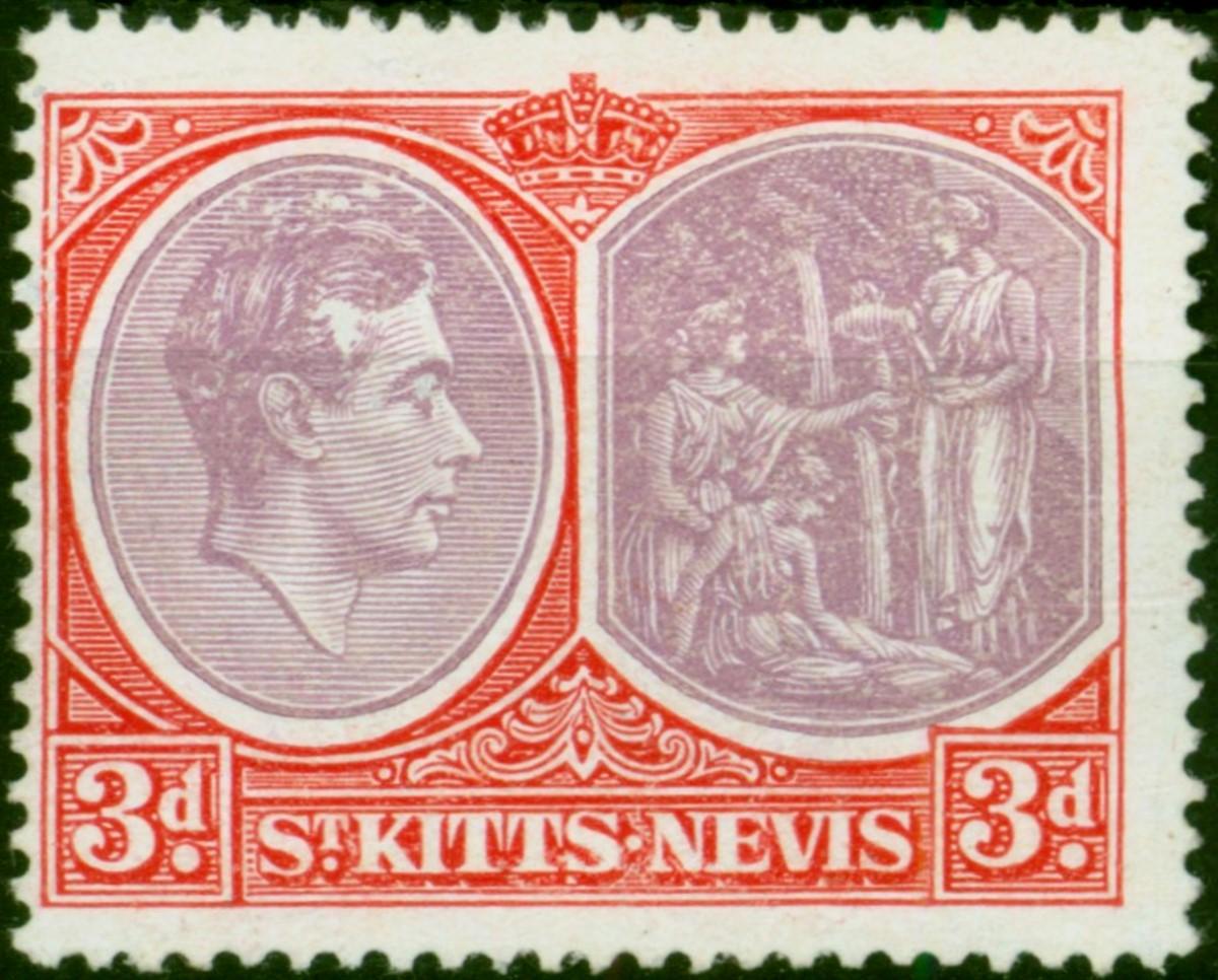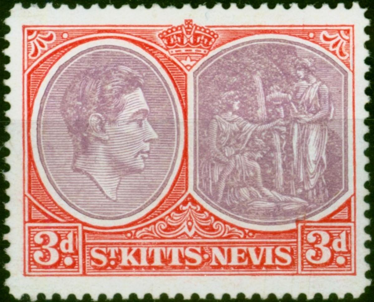 St Kitts Nevis 1943 3d Dull Reddish Purple & Carmine-Red SG73 P.14 Chalk Fine MM