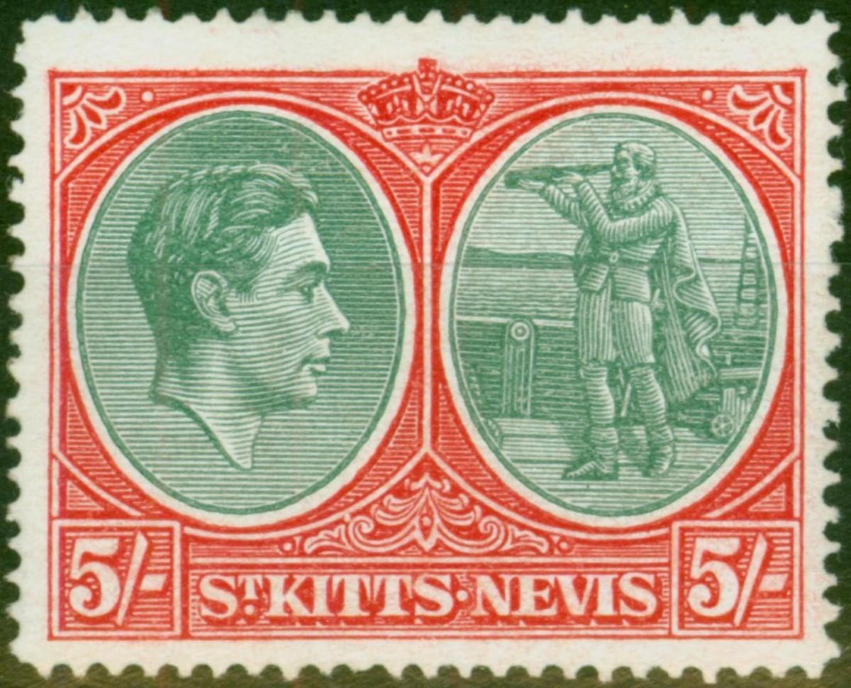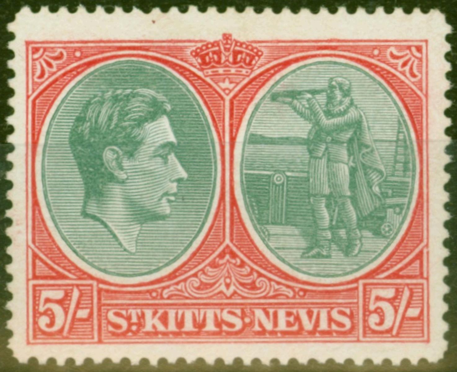 St Kitts 1945 5s Bluish Green & Scarlet SG77bb Break in Frame above Ornament Fine & Fresh MM