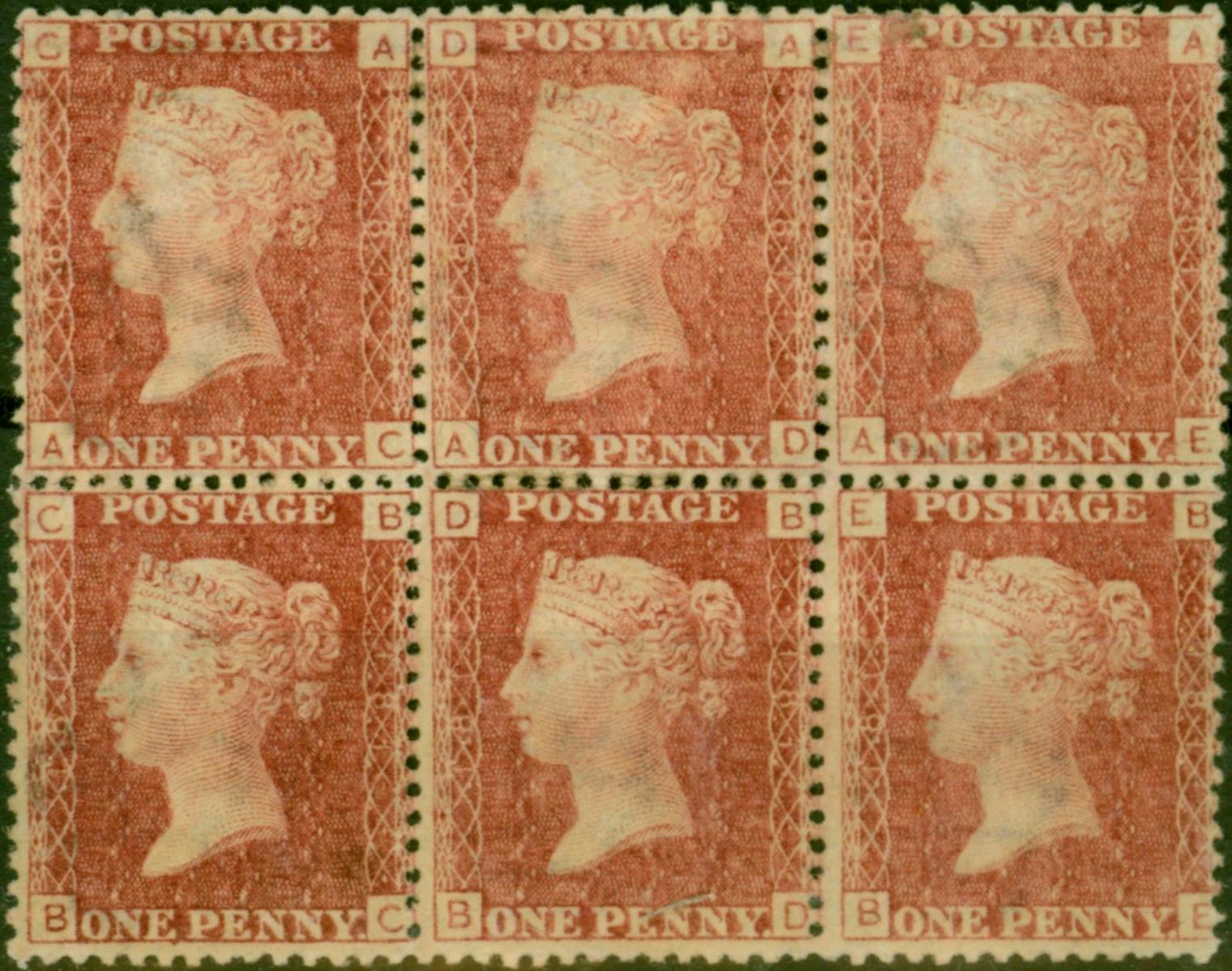 GB 1864 1d Rose-Red SG43-44 Pl 181 Fine MNH Block of 6 (A-C, B-E)