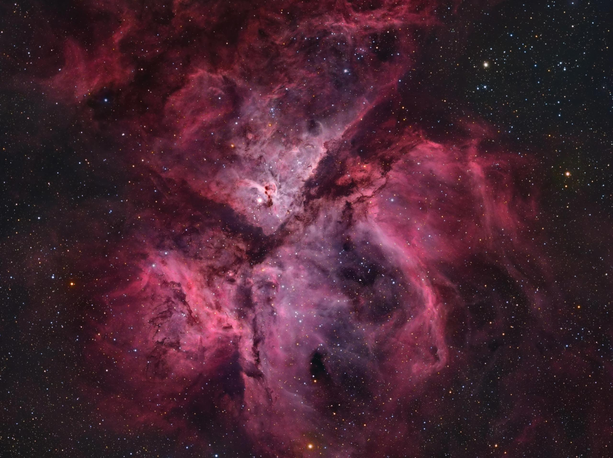 Eta Carinae is embedded within a large cloud of glowing gas known as the Eta Carinae Nebula. This is the largest and brightest nebula of its type anywhere in the sky, and it can easily be seen with the unaided eye from the Southern Hemisphere.