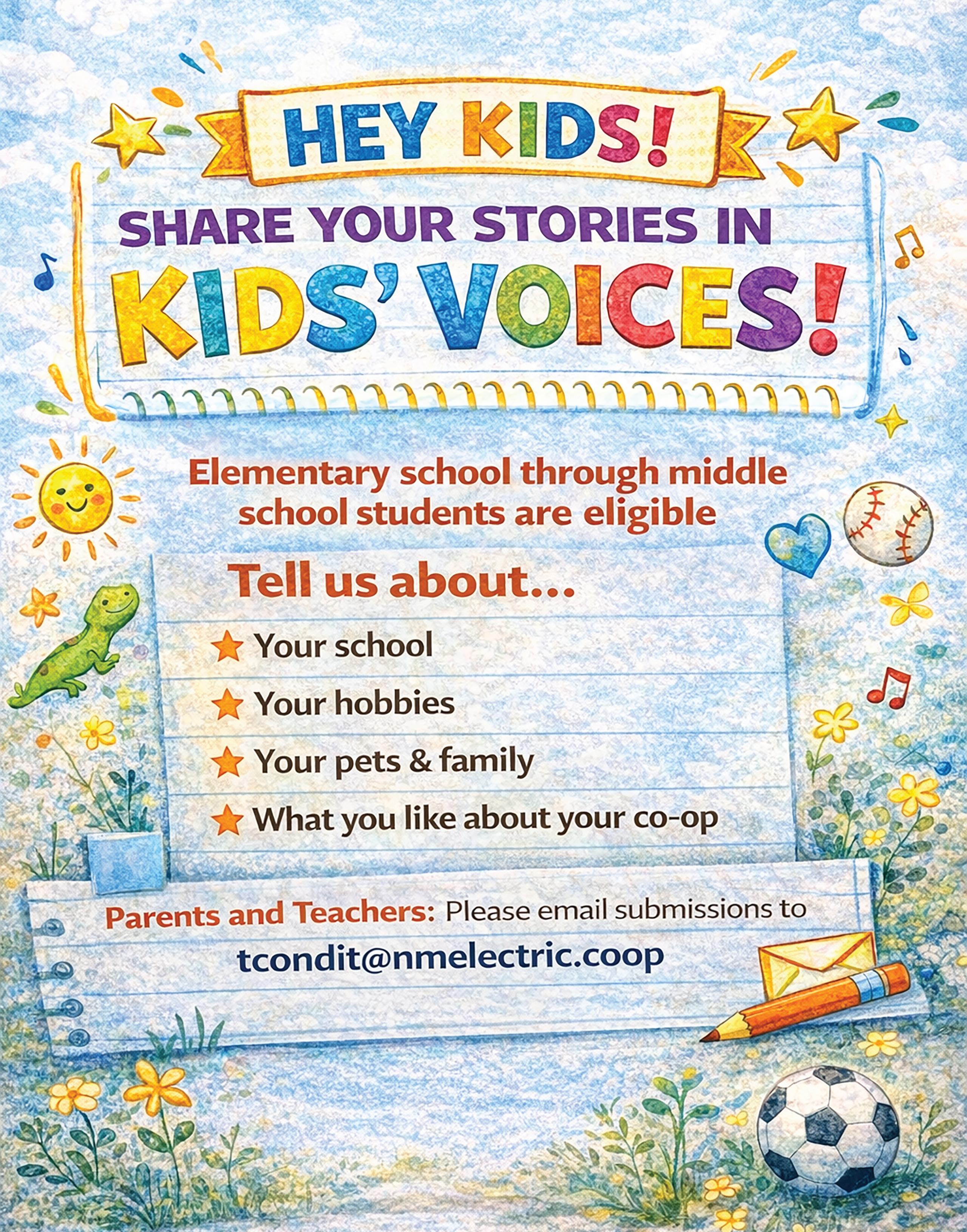 Send your event details to eventcalendar@nmelectric.coop. Include the event title, date, town and a summary of the event. Include the event website address so readers can get additional event information. Submit the event notification at least 60 days before the event to meet our press deadline. Space is limited, and events are published at the discretion of the editor.