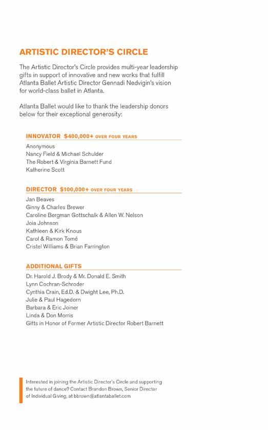 GENNADI NEDVIGIN (Artistic Director), in February 2016, was named Atlanta Ballet’s fourth artistic director in the Company’s then 87-year history. Nedvigin, born in Rostov, Russia, began his training at age 5. At 10, he was accepted into the Bolshoi Ballet Academy. Upon graduating, he joined Moscow Renaissance Ballet as a soloist before he was invited to dance with Le Jeune Ballet de France in Paris. In 1997, while on tour in the U.S., San Francisco Ballet (SFB) Artistic Director Helgi Tomasson offered Nedvigin a soloist contract. After three years, he was promoted to principal dancer. During 19 seasons at SFB, Nedvigin won the International Competition’s Erik Bruhn Prize (1999). He has also received three Isadora Duncan Dance Awards (2001, 2010 and 2017). Along the way, Nedvigin was fortunate to work with many world-renowned choreographers. In addition to his dancing career, Nedvigin also taught master classes and staged ballets in the U.S. and abroad before becoming an artistic director. Recently, Nedvigin sat on juried panels at the World Ballet Competition in Orlando, the International Ballet Competition held in Jackson, Mississippi, the Japan Grand Prix and the Youth America Grand Prix. Under Nedvigin’s guidance, Atlanta Ballet has established the Academy training program, which includes a top-tier performance ensemble, Atlanta Ballet 2, representing his commitment to training for the next generation of professional dancers.