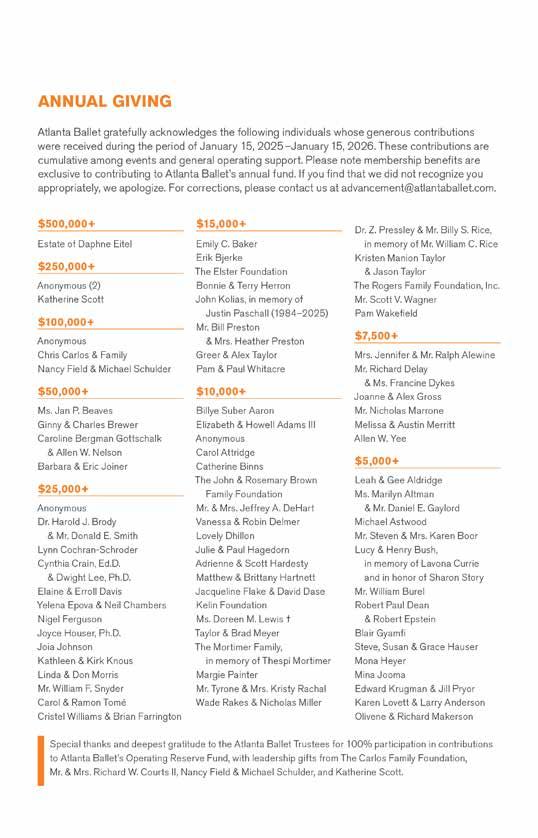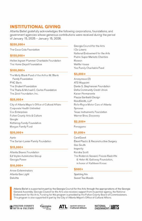 WEST (Executive Director) assumed his role as Atlanta Ballet’s Executive Director in 2021. West’s career in arts management spans more than 25 years, including leadership roles at the John F. Kennedy Center for the Performing Arts, the Segerstrom Center for the Arts and American Film Institute. An actor and theatre director by training, West received a Master of Arts in arts management from American University and began his career in arts management at the Kennedy Center in 1997, where he rose to serve as Vice President of Development, overseeing all fundraising programs for the National Symphony Orchestra and the Suzanne Farrell Ballet, and leading Farrell’s effort to fund a remount of Balanchine’s Don Quixote. In 2007, West served as Vice President of Development for the Segerstrom Center for the Arts in Costa Mesa, California. From 2010-2021, West served as the Chief Advancement Officer for the American Film Institute (AFI) in Los Angeles, where he championed the development of new programs to provide bridges to the film industry for under-represented storytellers in Hollywood. West established the AFI National Council in 2011, a community of philanthropists from across the United States who serve as champions for excellence in the art of film and opportunities for the next generation of great storytellers. Since joining Atlanta Ballet in 2021, West’s focus has been on Atlanta Ballet’s long-term financial health and prestige, expanding engagement in the greater Atlanta region and breaking down historic barriers to full participation in the artform of Ballet for all.