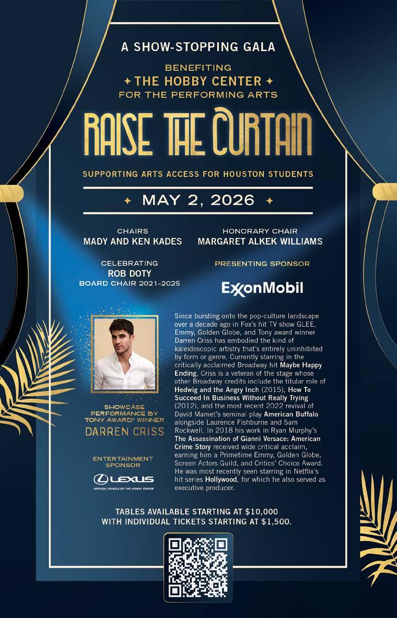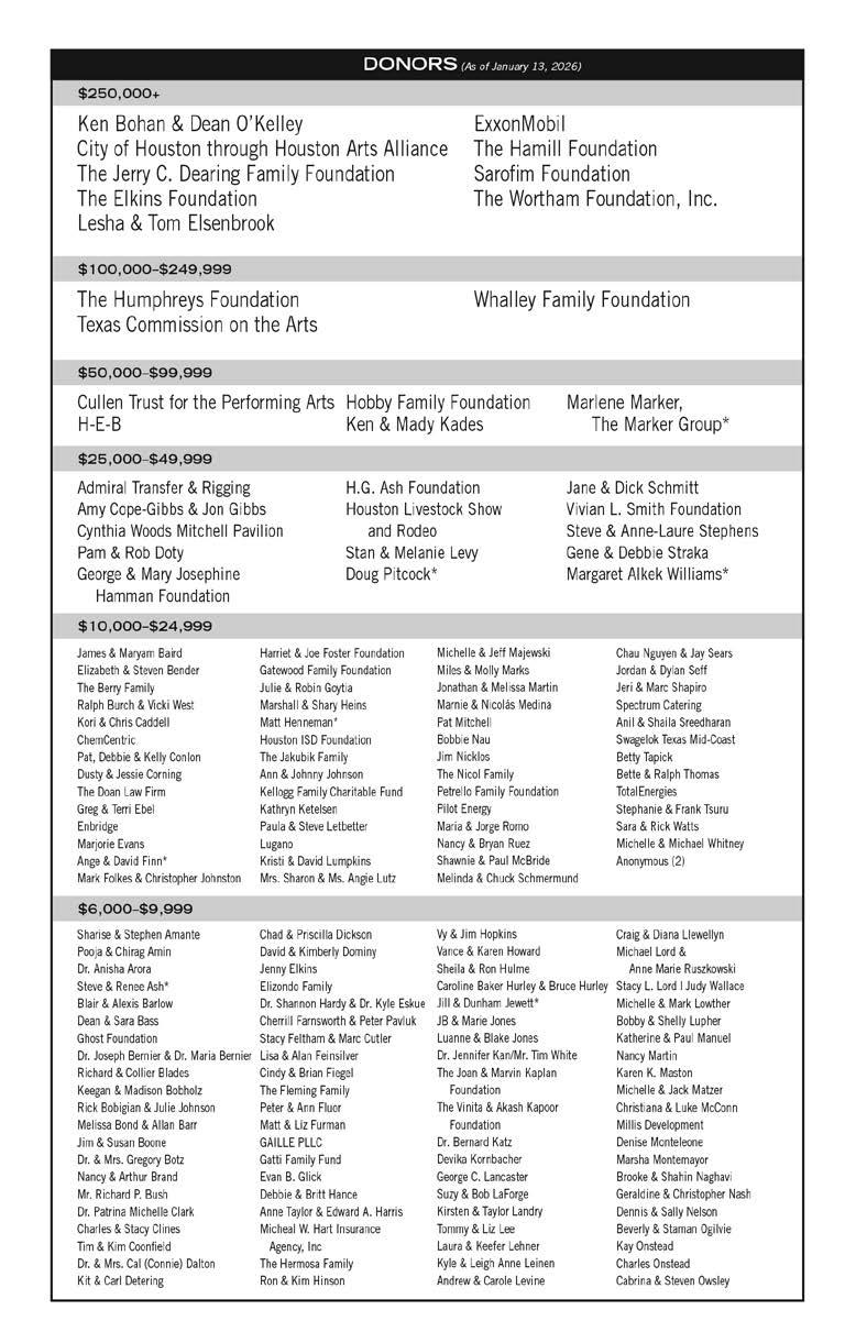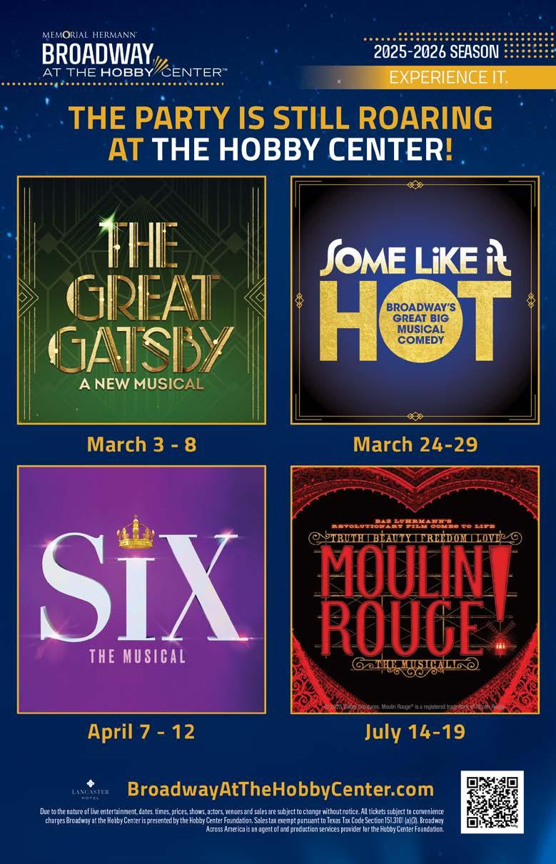 This month we were thrilled to announce the 2026 – 2027 Memorial Hermann Broadway at the Hobby Center Season. Next fall will open with the beloved family favorite, Rogers and Hammerstein’s The Sound of Music, followed by the return of another 2019 hit, Beetlejuice, and the Tony Award winning Buena Vista Social Club, a personal favorite of mine! Winter 2027 brings five new tours straight from New York, starting with The Notebook and Boop the Musical in January, Hell’s Kitchen in March, Death Becomes Her in April, and Harry Potter and the Cursed Child in June. We are elated to welcome the return of Wicked for five weeks in June 2027, followed by our season closer, Jersey Boys, in August. Thank you to those who have already joined us as subscribers. If you are interested in becoming a season subscriber, please visit BroadwayAtTheHobbyCenter.com for more information.