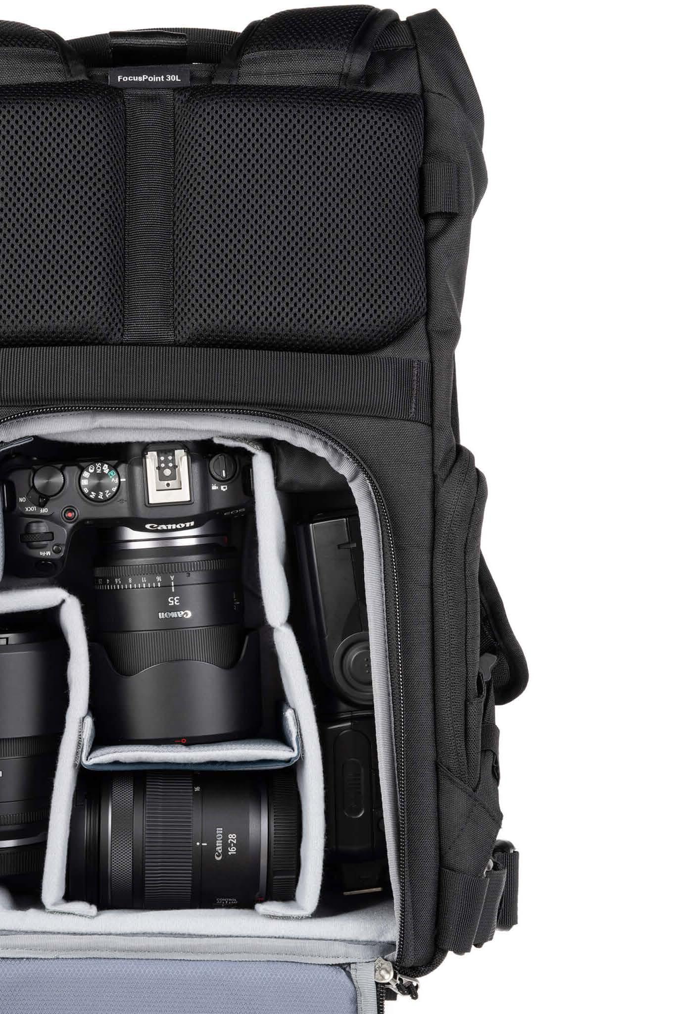 DESIGNED FOR PHOTOGRAPHERS ON THE GO, THE FOCUSPOINT 30L ROLLTOP CAMERA BACKPACK PROVIDES AMPLE SPACE FOR YOUR CAMERA, LENSES AND PHOTOGRAPHY EQUIPMENT. WITH A CUSTOMIZABLE REAR COMPARTMENT WHERE YOU CAN CREATE THE PERFECT CONFIGURATION FOR YOUR PHOTOGRAPHY EQUIPMENT NEEDS, THE BACKPACK IS DESIGNED TO KEEP ALL YOUR EQUIPMENT AND PERSONAL BELONGINGS SAFE, MAKING IT THE IDEAL BAG FOR TAKING WITH YOU ON TRIPS OR THROUGH EVERYDAY LIFE.
