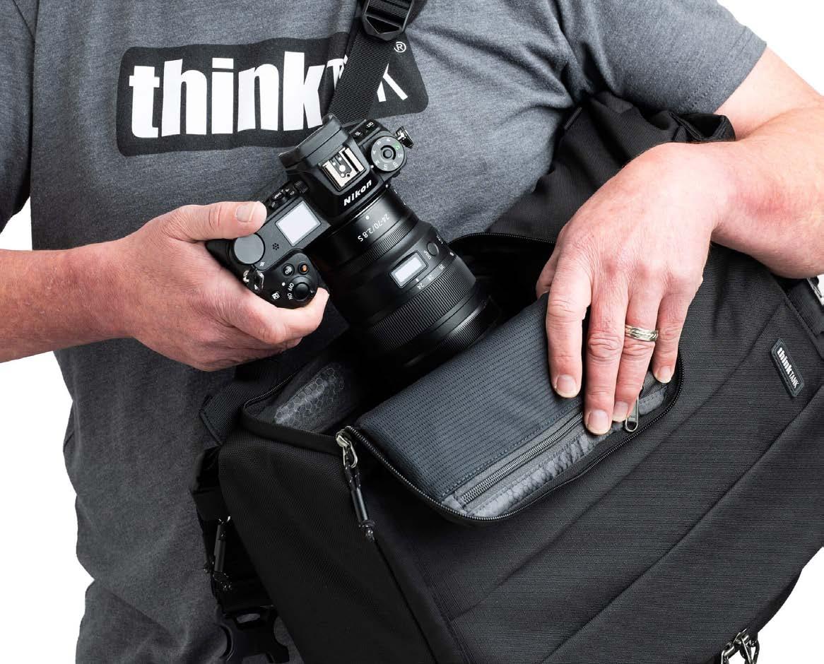 innovative, due to the customisable camera equipment storage design. The main camera storage compartment can be accessed via the back of the backpack, via a direct zip-open section to your equipment. When opening this section, the compartment features an adjustable camera insert, where you can move around the panels to securely hold your camera and lenses. According to Think Tank, you can fit 1 full frame body (ungripped) and 2 f/2.8 zooms, and 1 full frame body (ungripped) and 3-5 primes in this section. I like that the compartments to store each part can be adjusted to fit your camera and equipment’s needs. Also included in this section is a waterproof cover that