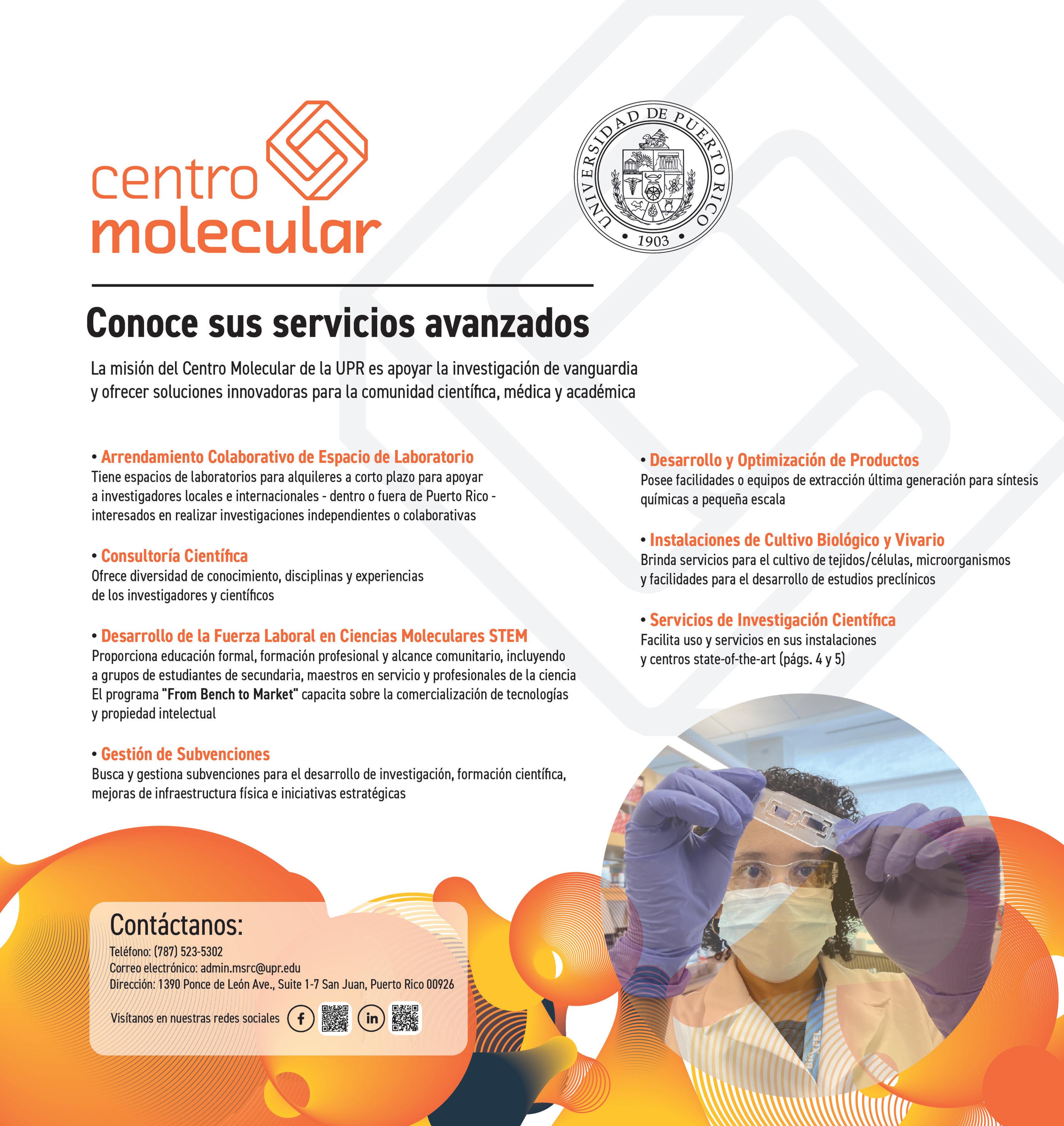 Por Rut N. Tellado DomenechEl Centro Molecularde la UPR inició su caminohacia la autosuficiencia económica, mediante un modeloque incluye espacios colaborativos de laboratorios que funcionan como incubadoras para pequeñasempresas, asícomo con el ofrecimiento de servicios técnicoscientíficos ydenegocios ala academia y al sector privado.