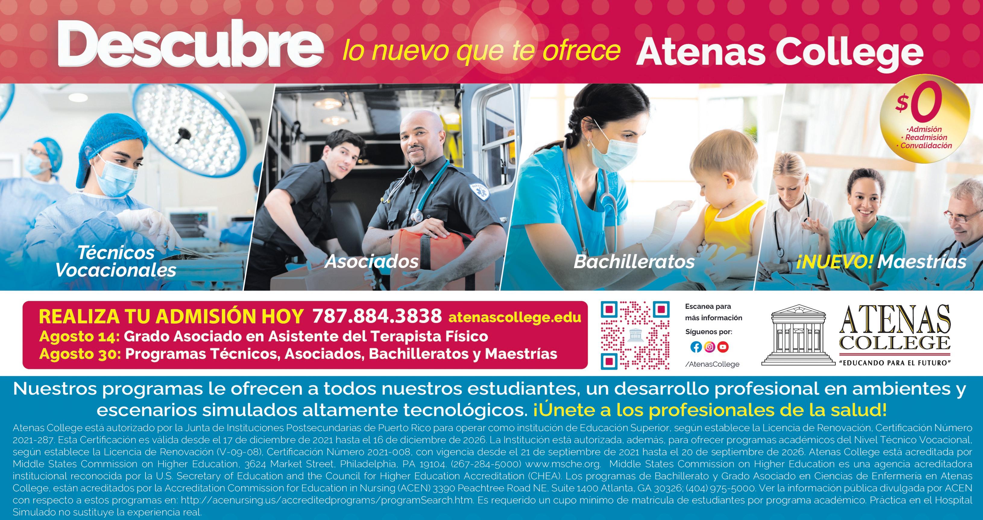 Actualmente, Atenas College tiene matrícula abierta para loscursos que comienzan en agosto. ¡Llama ahora al 787-884-3838 ycoordina unavisita y, deuna vez,conoceel primerHospital Simulado de Puerto Rico y el Caribe! Vive tu pasión y lideratu experiencia en Atenas College.