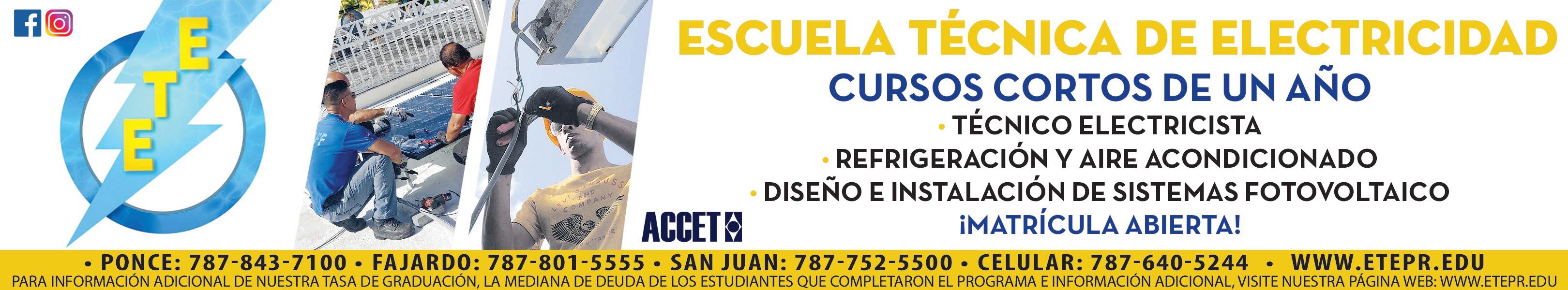 Actualmente, se encuentra en proceso de matrícula para nuevos cursos. Paraorientacióndesuscursosacadémicos, llamaalrecintodePonceal 787-843-7100; enSan Juan al787-752-5500; y enFajardo al 787-801-5555. Tambiénpuedes visitarsus redessociales enwww.etepr.edu, FB: Escuela Técnica de Electricidad e IG: @etepr84. Estánlistos paramatricularte Y tú,¿estáslisto? Veyconéctate ala corriente del futuro.