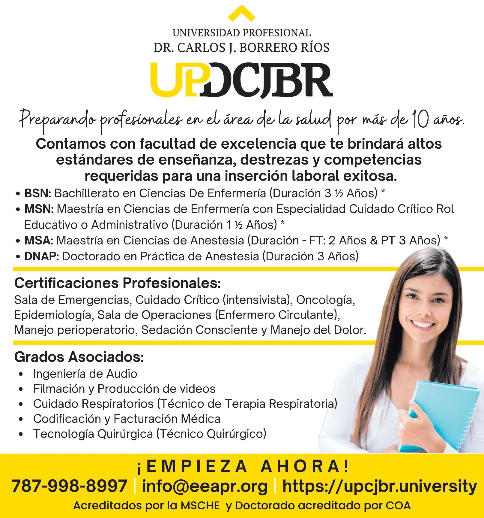 ICPR Junior College (ICPRJC) presenta su nuevo programa académico:Certificado Profesional en Cuidado delPaciente Adulto. Atemperado a las necesidades dela poblacióndecuidadores en Puerto Rico, este programa responde alas necesidades demográficas, sociológicasy económicas de la población de envejecientes en Puerto Rico. El programa de estudios, que consta de 36 créditos, está diseñadopara completarseen unañoy seencuentradisponible en diversas modalidades, tanto presencial como virtual. Los estudiantes tendránla oportunidad de conocer lasnecesidades de esta comunidad, mediante un currículo educa-