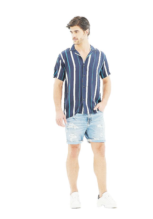 Pasea por la isla en las vacaciones navideñas con estilo y comodidad. Este atuendo de camisa a rayas y pantalón corto de mezclilla es perfecto. Consigue ropa a la última moda en Carbon, ubicada en el primer nivel.