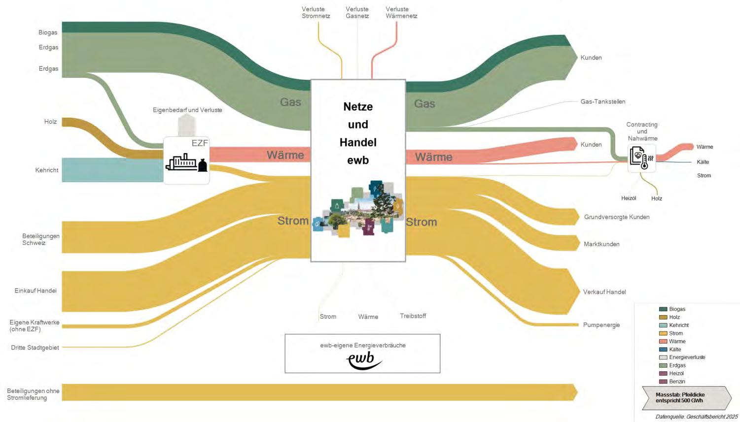 Das nachfolgende Energiefl ussdiagramm visualisiert, die durch ewb produzierten, gehandelten und verteilten Energien.