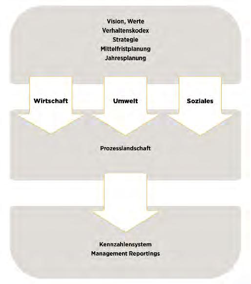 Energie Wasser Bern verpflichtet sich zu einer nachhaltigen, integrierten Unternehmensführung. Die Verpflichtung für die Nachhaltigkeit ist sowohl in der öffentlich zugänglichen Eignerstrategie als auch im internen Verhaltenskodex festgehalten. Dieses Versprechen widerspiegelt sich im integrierten Managementsystem: Das Drei säulenprinzip der Nachhaltigkeit mit den ökonomischen, ökologischen und sozialen Dimensionen ist im Unternehmen fest verankert und nimmt im Tagesgeschäft einen hohen Stellenwert ein. Im Fokus steht dabei das Prozessmanagement.