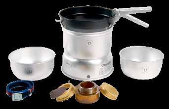 För 1-2 personer. Två kittlar, 1,0 liter, en stekpanna Ø180 mm, vindskydd (övre och undre), spritbrännare, tång samt rem.