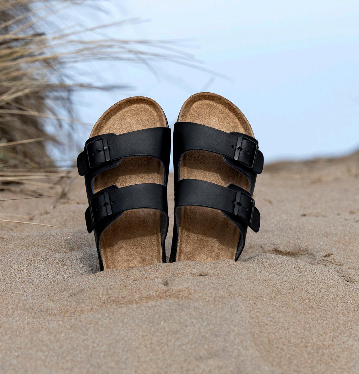 Klassisk sandal med bekväm korksula som ger skönt stöd. Ovandel av skinnimitation, insida av textil och sula i EVA som ger dämpning. Justerbara remmar med spännen. Svart.