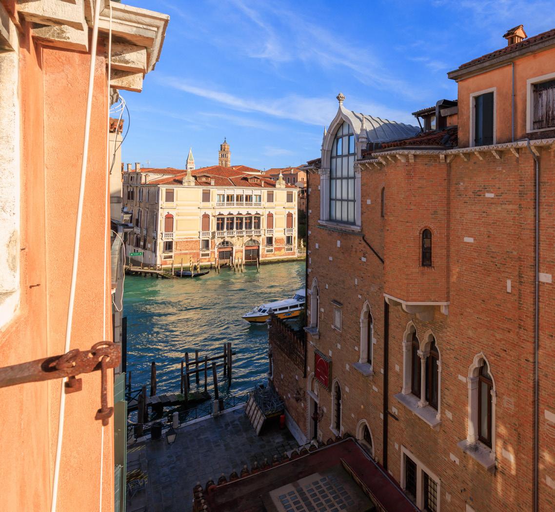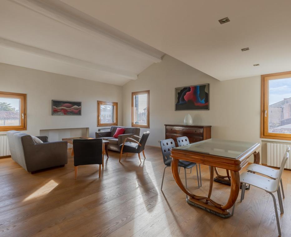 light opens up before us, with views of the field below and of La Fenice. On the same floor we then find a delightful pastelcoloured kitchen with a splendid view of St Mark's bell tower. We go up the stairs from the entrance hall to the sleeping area, where we find four bedrooms and three bathrooms, with elegant finishes such as wooden floors and classy stucco work. The views from these rooms are priceless: from one, one has the impression of being in St. Mark's Square, the domes and bell tower towering over the panorama; another room, on the other hand, equipped with two walk-in wardrobes, leads to a veranda, formerly a terrace.