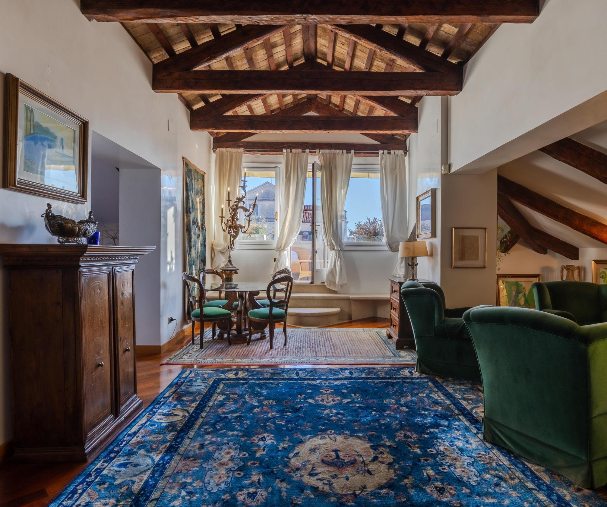 terrace overlooking the South Lagoon and various other spaces/wardrobes. The beauty of this gem never ceases to amaze us. Returning to the great hall, we climb the stairs and pass between the imposing trusses to reach one of the jewels of the house: a magnificent altana with a 360° view. From here you can admire the entire Venetian panorama, from the South Lagoon to the Redentore with the entire Venetian skyline. This property is one of a kind, each element evoking absolute beauty and elegance, all set