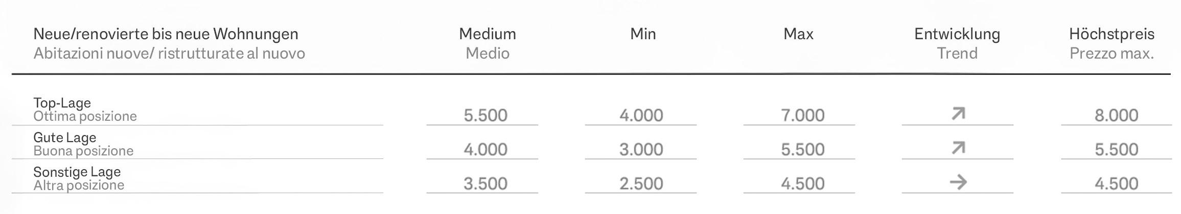 Die Preisspanne in Bozen ist mit 4.200 bis 10.000 €/m² stark von der jeweiligen Lage abhängig. Im Vergleich dazu liegen die Preise für renovierte Objekte im Überetsch/Unterland bei rund 5.000 €/m². Deutlich höhere Preise werden in Gröden erzielt, wo sie von 6.000 bis 11.000 €/m² reichen. Spitzenwerte von bis zu 25.000 €/m² können für die seltenen und einzigartigen Berghütten auf der Seiser Alm im Herzen des UNESCO-Welterbes erreicht werden.
