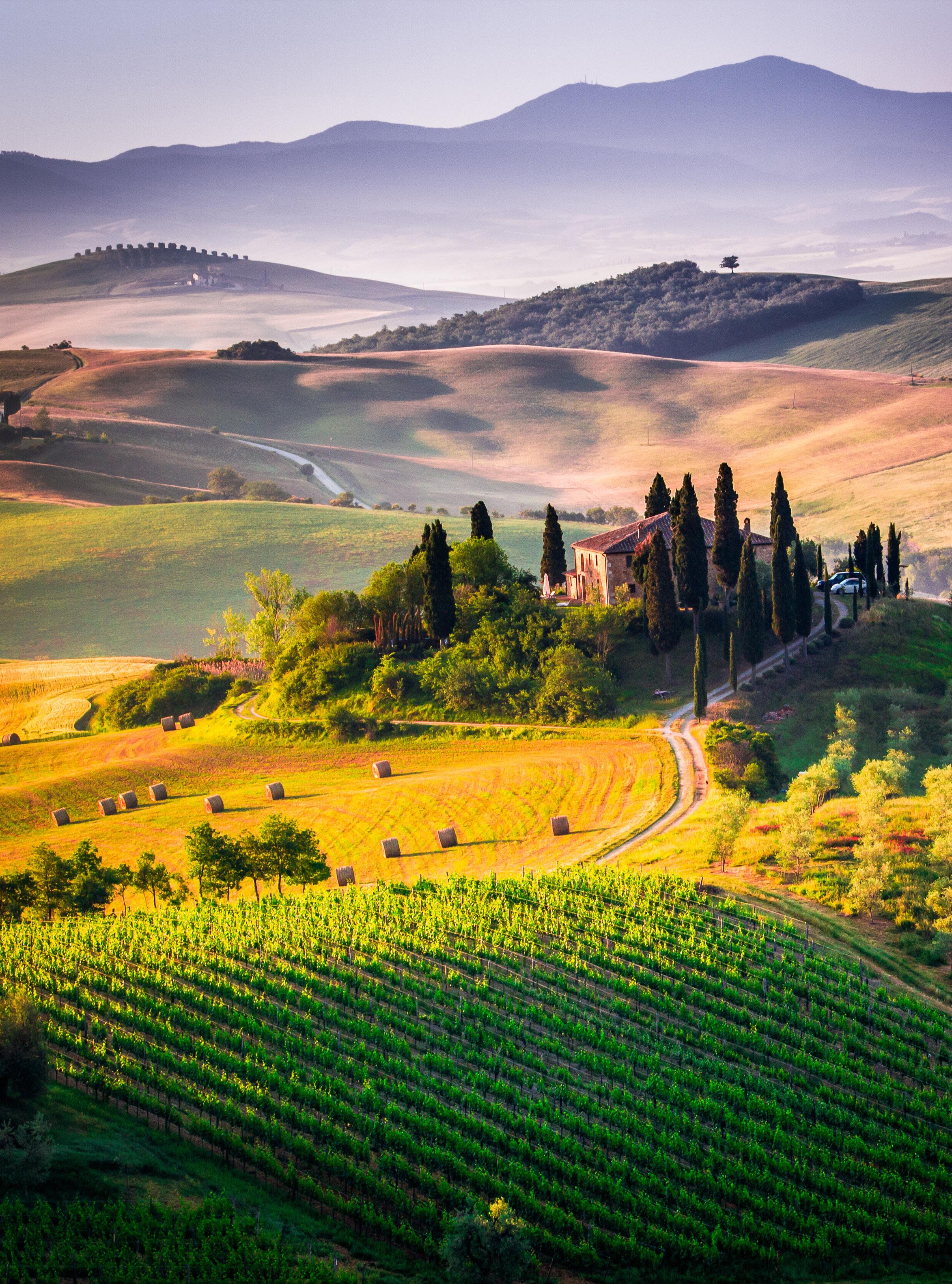 Chianti offers views of great charm: green hills covered by vineyards and olive groves, magnificent chestnut, oak and holm oak woods, winding roads, castles and suggestive medieval villages where peasant culture has survived, animated by the love for the land and for tradition. The harmony of nature surrounds the ancient churches that emerge delicately from the hills, witnesses of past centuries in the company of tall cypresses. Among the woods and the green geometry of the vines, ancient country houses are hidden where the sincere flavours of Tuscan cuisine have never ceased to conquer the palate of every visitor.