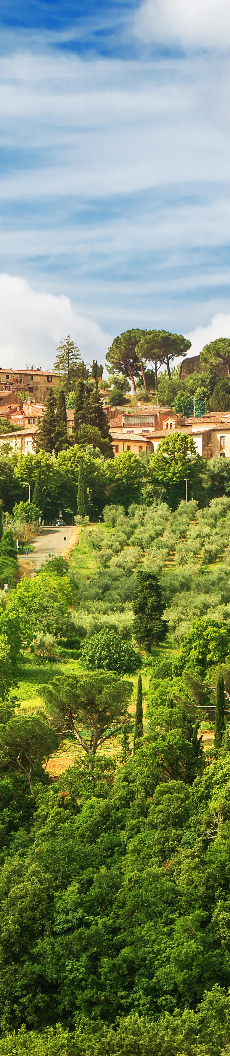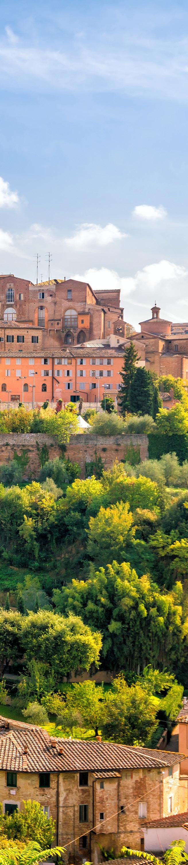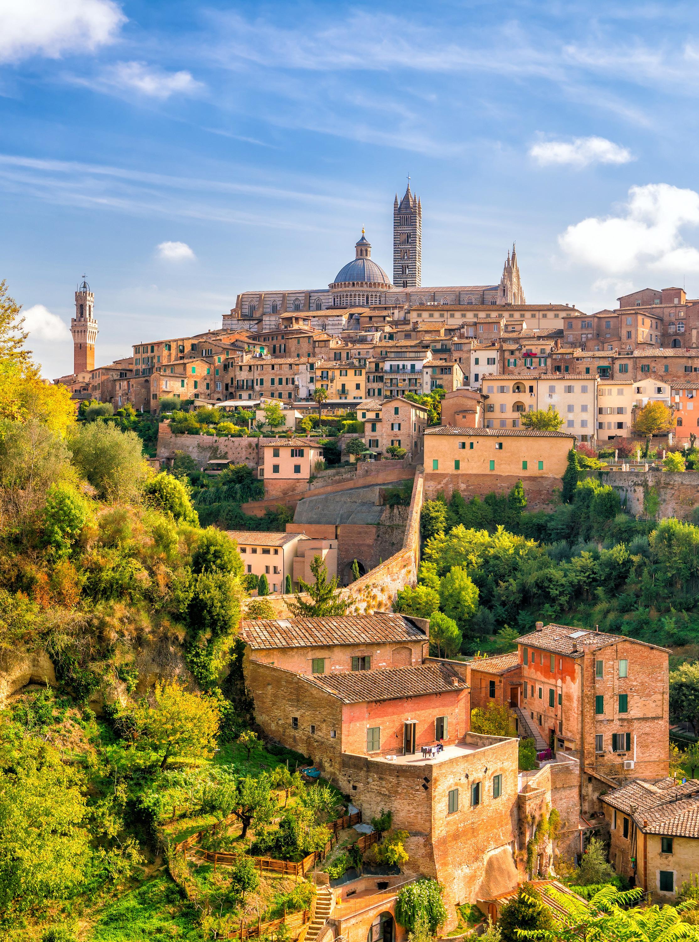 Located in the heart of Tuscany and surrounded by green hills, Siena can be seen from afar, resplendent in its medieval harmony. The three hills on which it stands are the high points in an idyllic backdrop of arable fields, where the edges of the ancient city blend into an unspoiled countryside rich in variety.