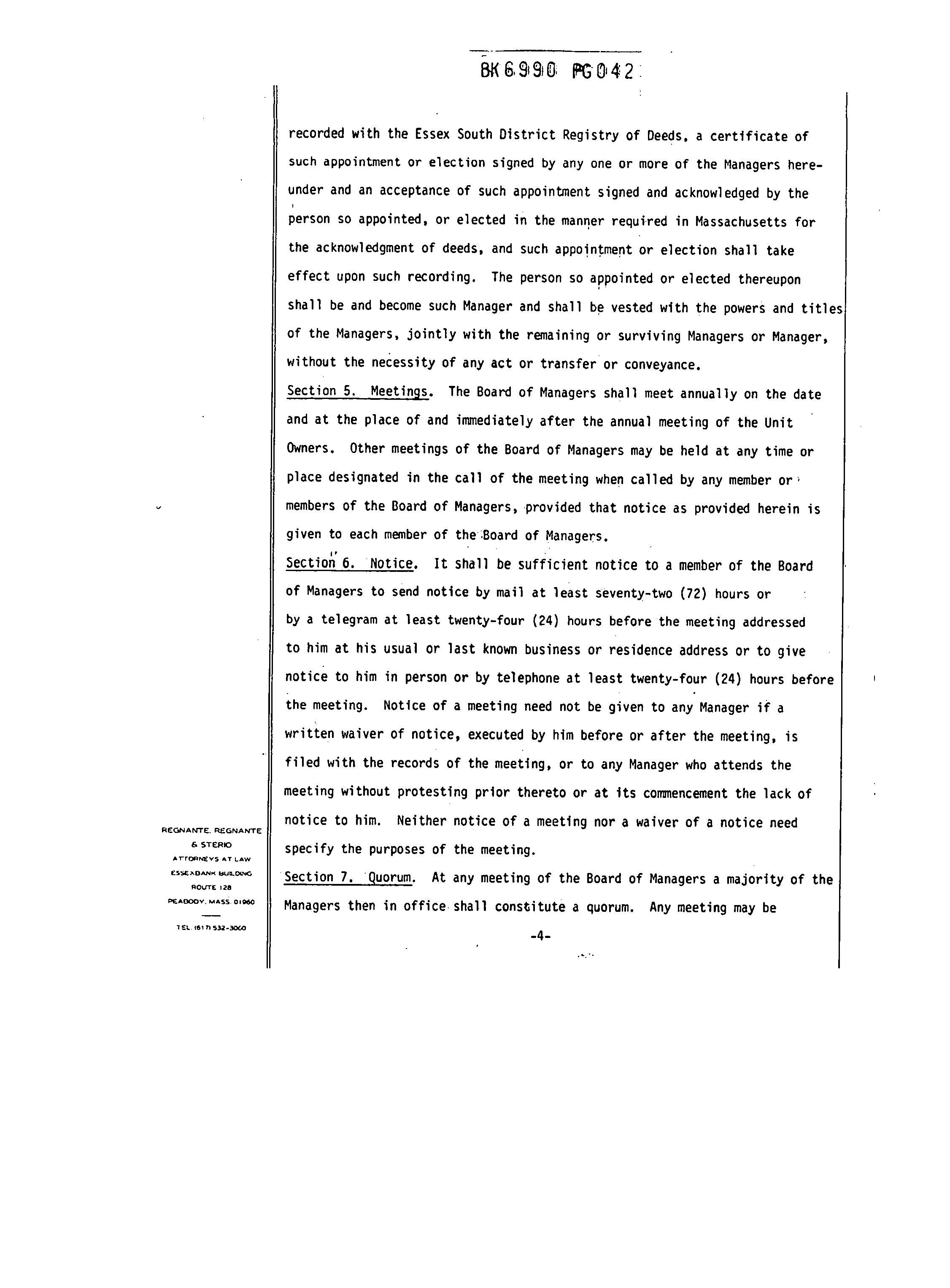 such Unit Owner as set forth in Exhibit C annexed hereto and incorporated herein The names of the Board of Managers of the Association (the "Board of Managers") are John D. McNiff, 14 Blackburn Center, Gloucester, MA; Roland H. Smith, II, Hickory Lane, Hamilton, MA; and Francis B. Mather, 94 Stewart Street, West Newbury, M .
