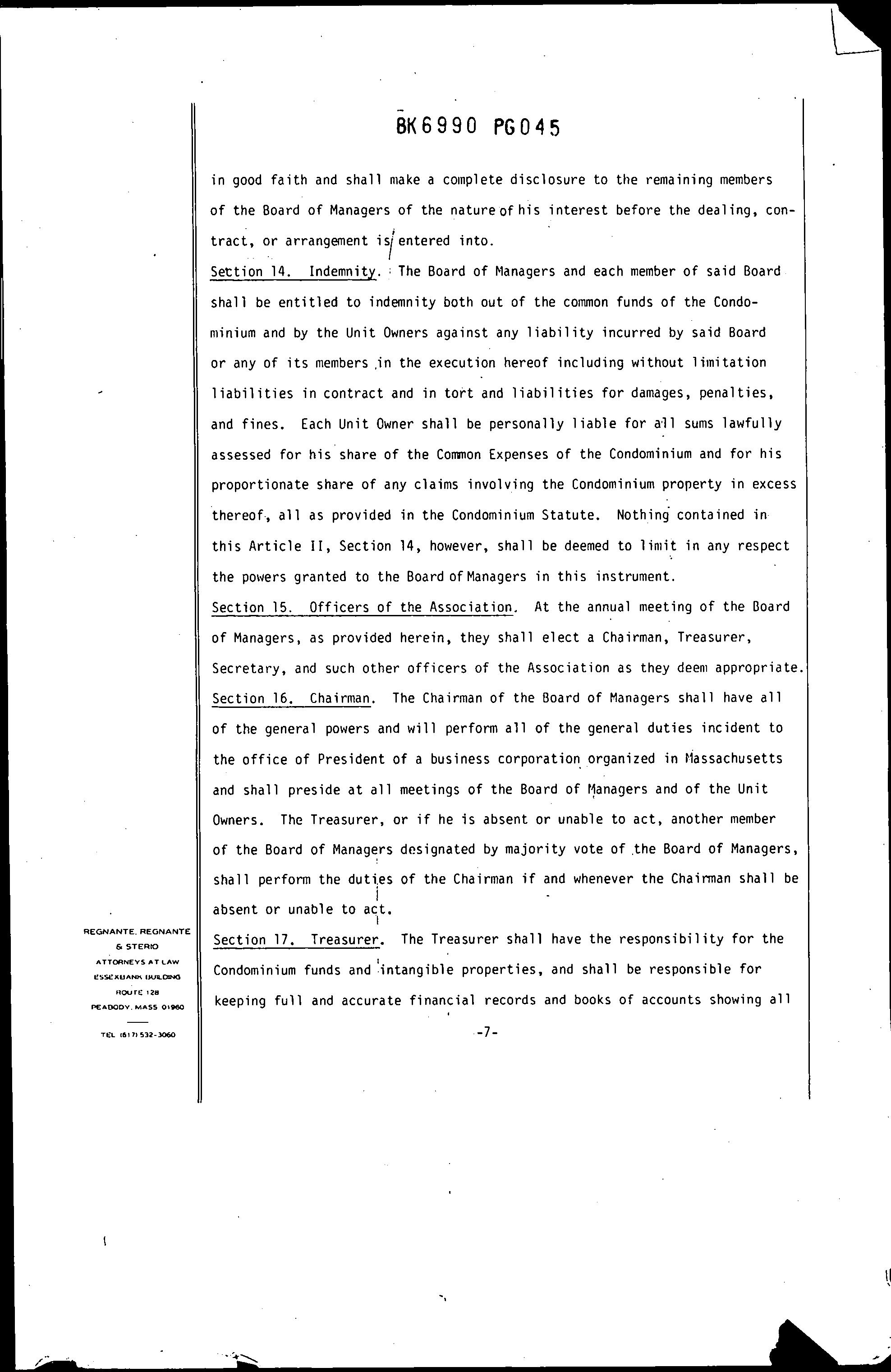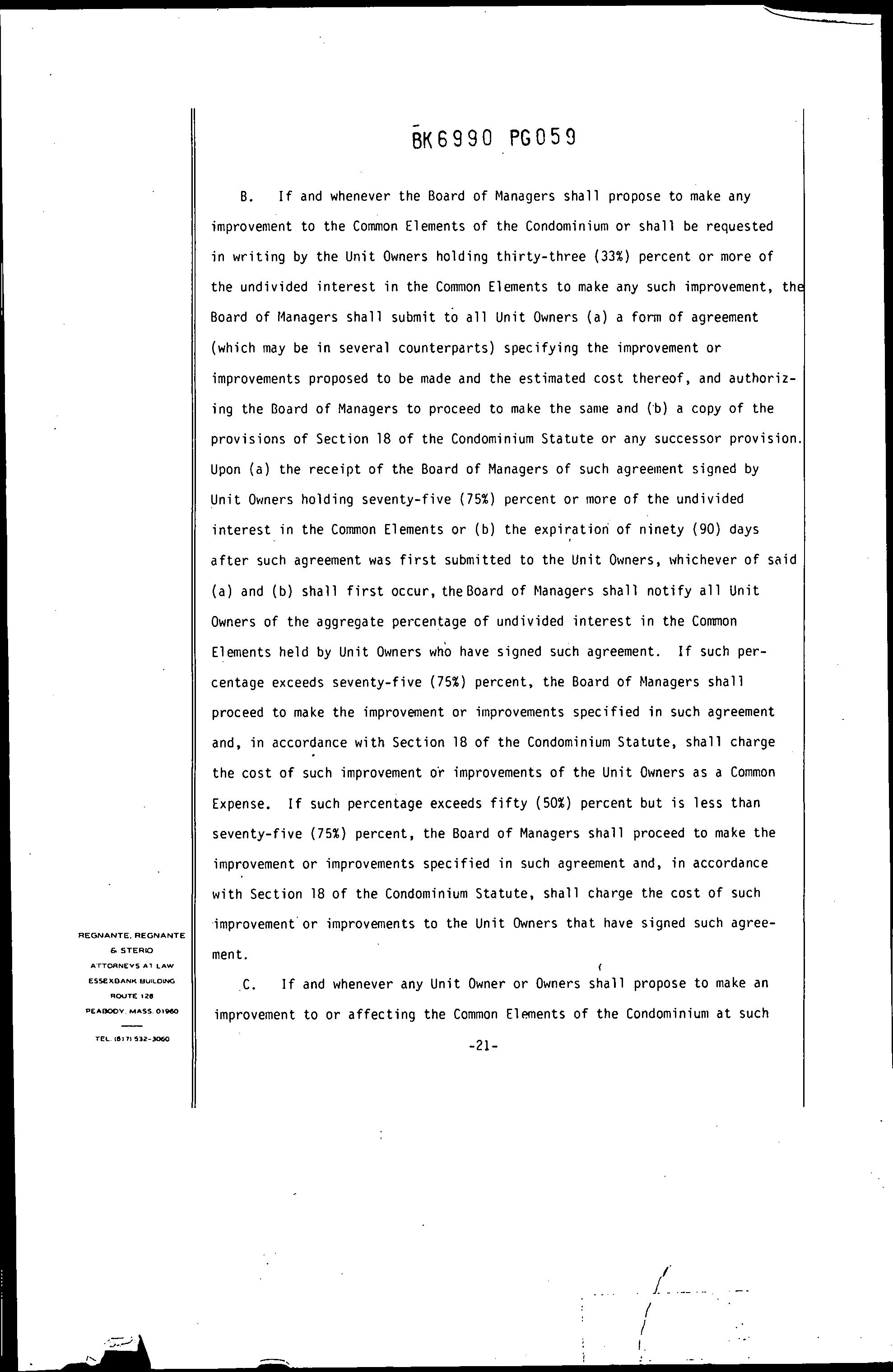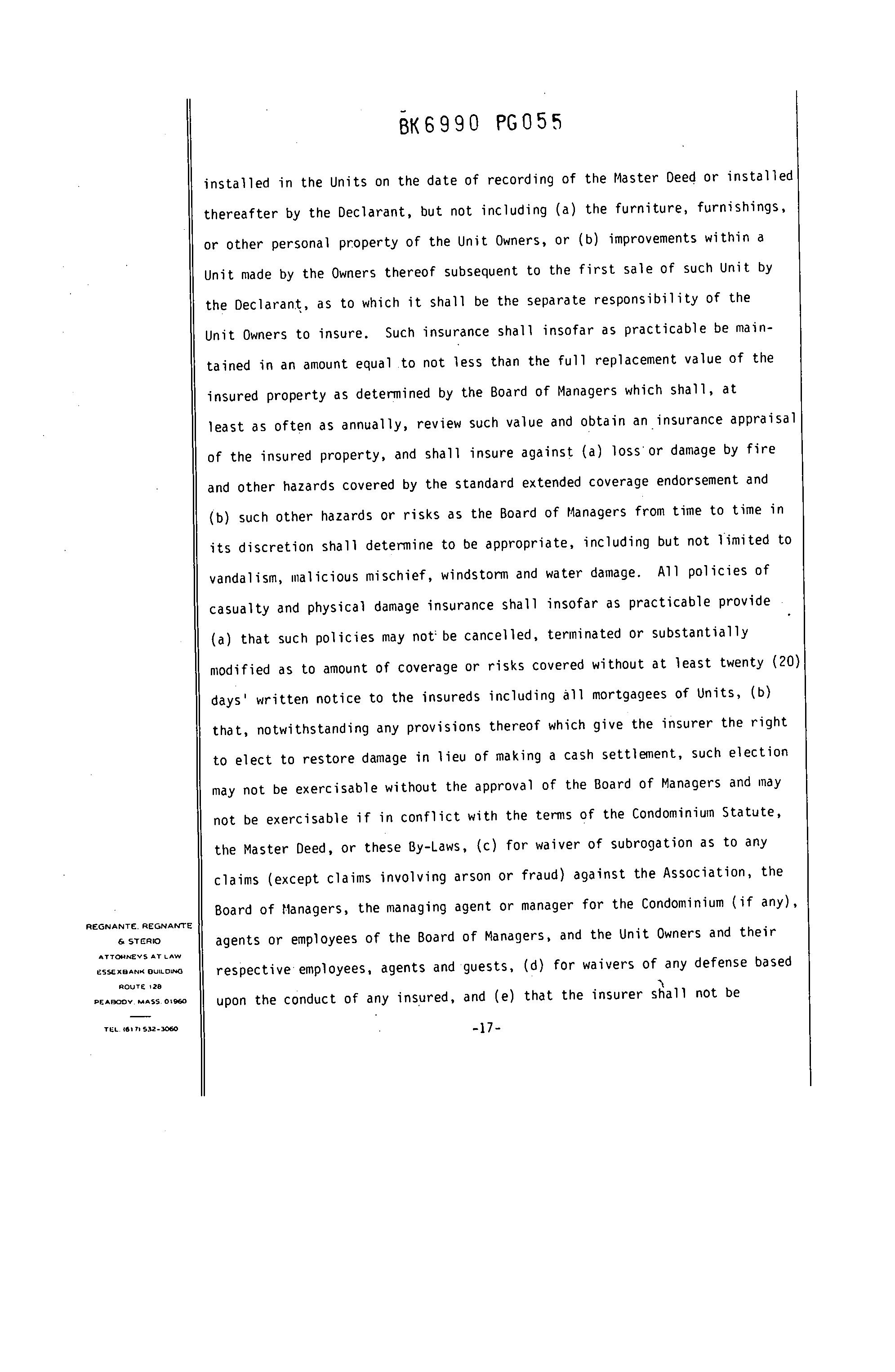 Reference isherebymade to those certain By-Laws dated October 8, 1982, which By-Laws established, pursuant to Massachusetts General Laws, Chapter 183A, the Old Nugent Farm Condominium Association, the organization of Unit Owners of the Old Nugent Farm Condominium, a condominium established pursuant to Massachusetts General Laws, Chapter 183A, by a Master Deed dated October 8, 1982, and recorded with the Essex South Registry of Deeds in Book 6990, Page 13.
