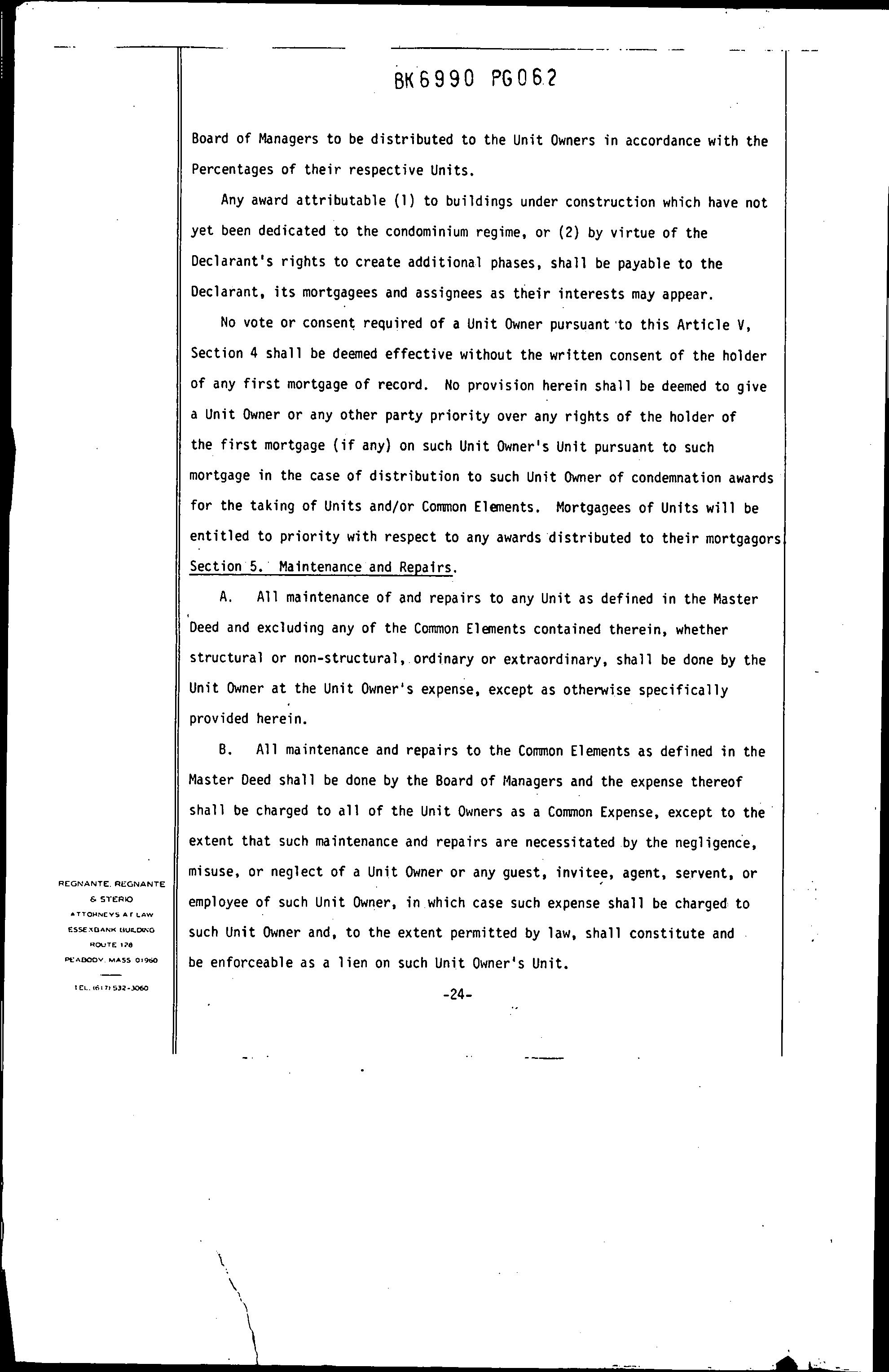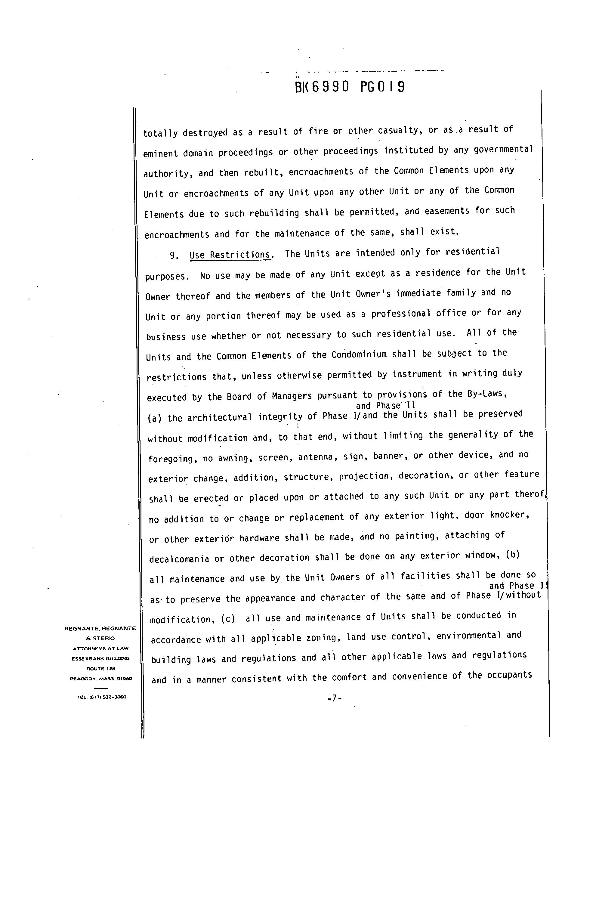 5. Description of Buildings. The buildings, hereinafter referred to as "Phase I" and "Phase II" constructed by the Declarant on the Land are threestory structures each containing four (4) townhouse Units with wood frame construction, white Atlantic cedar clapboard siding, asphalt shingle roofing, and concrete foundation, together with a detached garage. The location of Phase I and Phase II on the Land is shown on a plan entitled "Site Plan Old Nugent Farm Condominium, Gloucester, Mass., Scale 1"=100' dated September 24, 1982, drawn by Hayes Engineering, Inc. Civil Engineers and Land Surveyors", and recorded therewith are Phasing Plans for Phase I and Phase II drawn to the ! Scale 1"=20' depicting the dimensions of the buildings, and location and dimensions of the garaged and surface parking spaces recorded herewith, said Plans being part of the Condominium Plans referred to in Section 10 hereof.