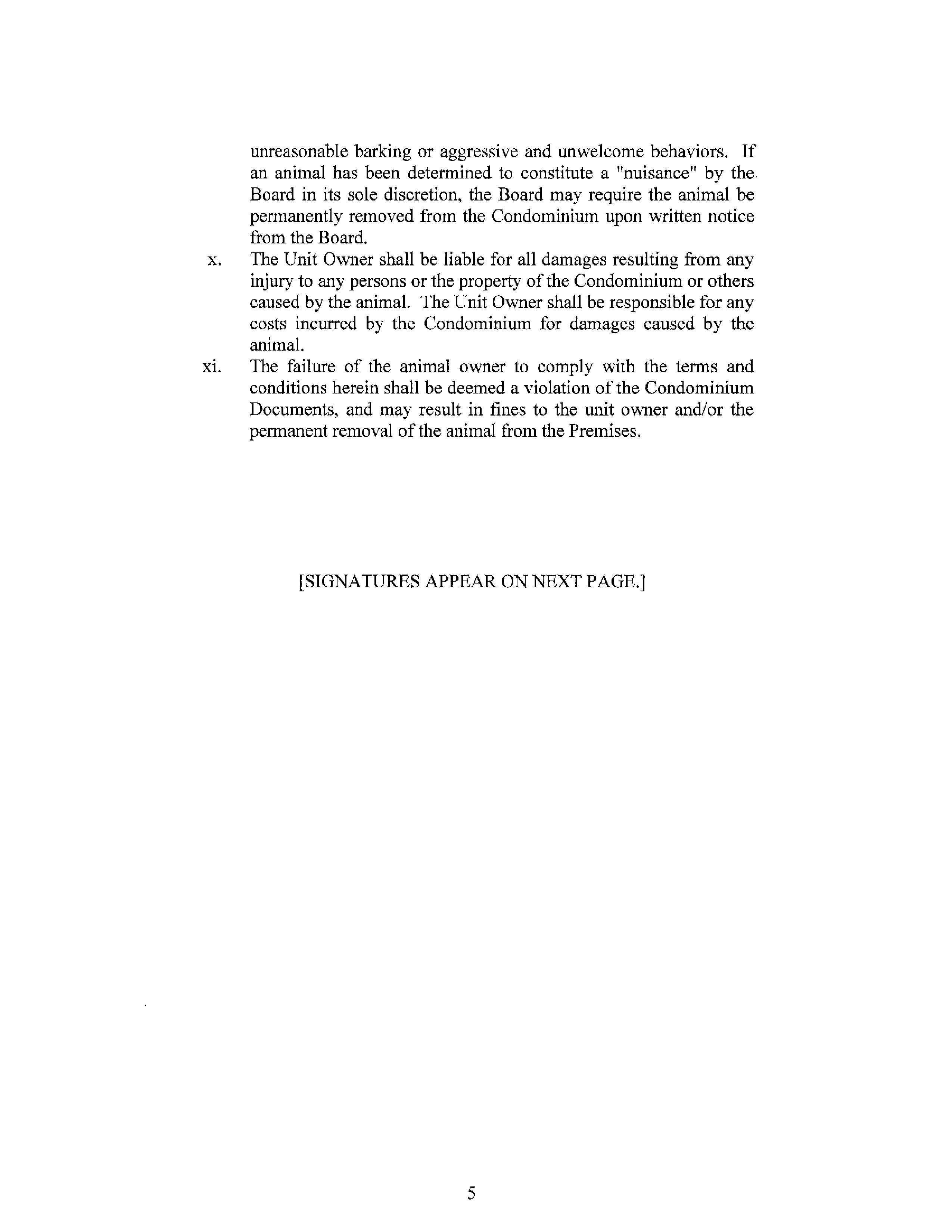 unreasonable barking or aggressive and unwelcome behaviors. If an animal has been determined to constitute a "nuisance" by the. Board in its sole discretion, the Board may require the animal be permanently removed from the Condominium upon written notice from the Board.