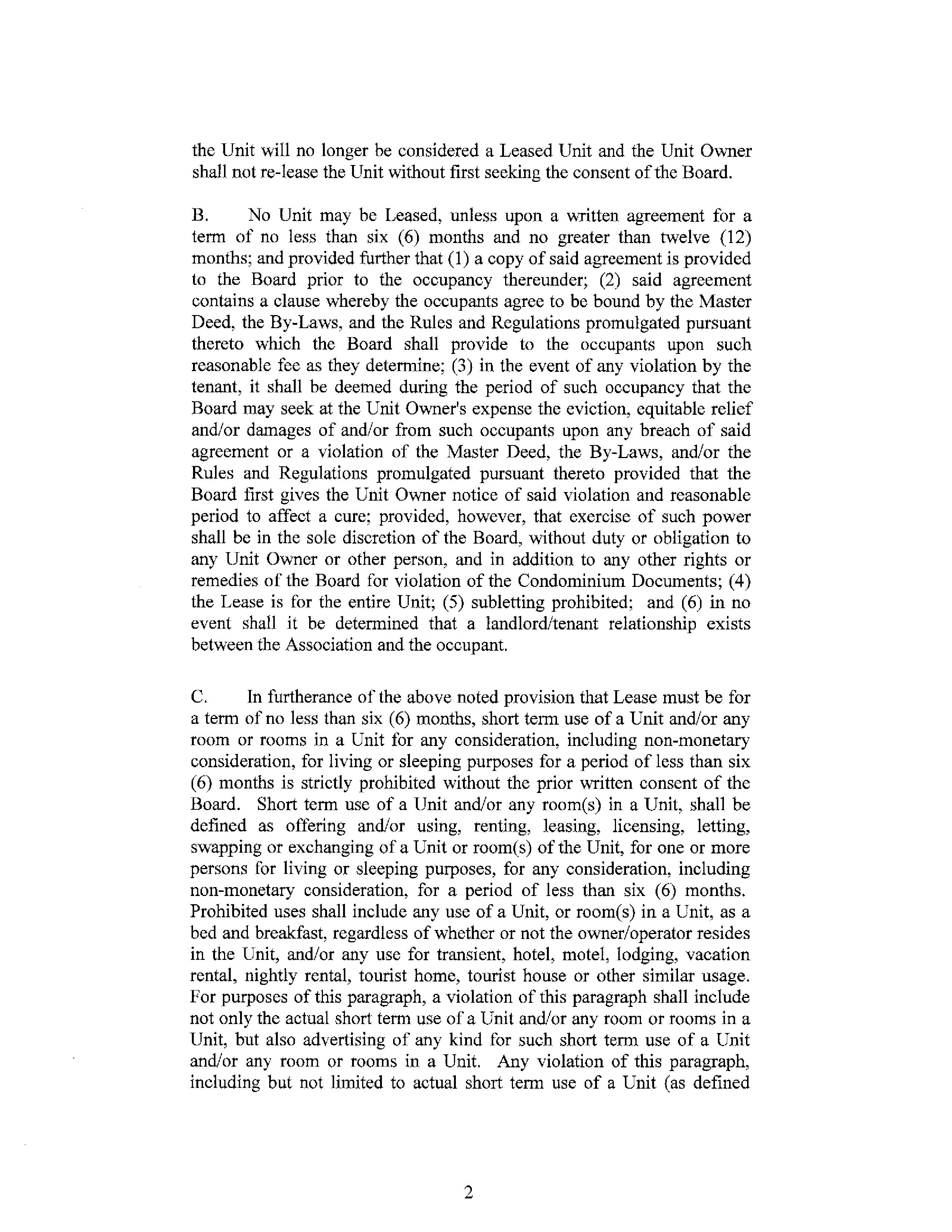 C. In furtherance of the above noted provision that Lease must be for a term ofno less than six (6) months, short term use of a Unit and/or any room or rooms in a Unit for any consideration, including non-monetary consideration, for living or sleeping purposes for a period of less than six (6) months is strictly prohibited without the prior written consent of the Board. Short term use of a Unit and/or any room(s) in a Unit, shall be defined as offering and/or using, renting, leasing, licensing, letting, swapping or exchanging of a Unit or room(s) of the Unit, for one or more persons for living or sleeping purposes, for any consideration, including non-monetary consideration, for a period of less than six (6) months. Prohibited uses shall include any use of a Unit, or room(s) in a Unit, as a bed and breakfast, regardless of whether or not the owner/operator resides in the Unit, and/or any use for transient, hotel, motel, lodging, vacation rental, nightly rental, tourist home, tourist house or other similar usage. For purposes of this paragraph, a violation of this paragraph shall include not only the actual short termuse of a Unit and/or any room or rooms in a Unit, but also advertising of any kind for such short term use of a Unit and/or any room or rooms in a Unit. Any violation of this paragraph, including but not limited to actual short term use of a Unit (as defined
