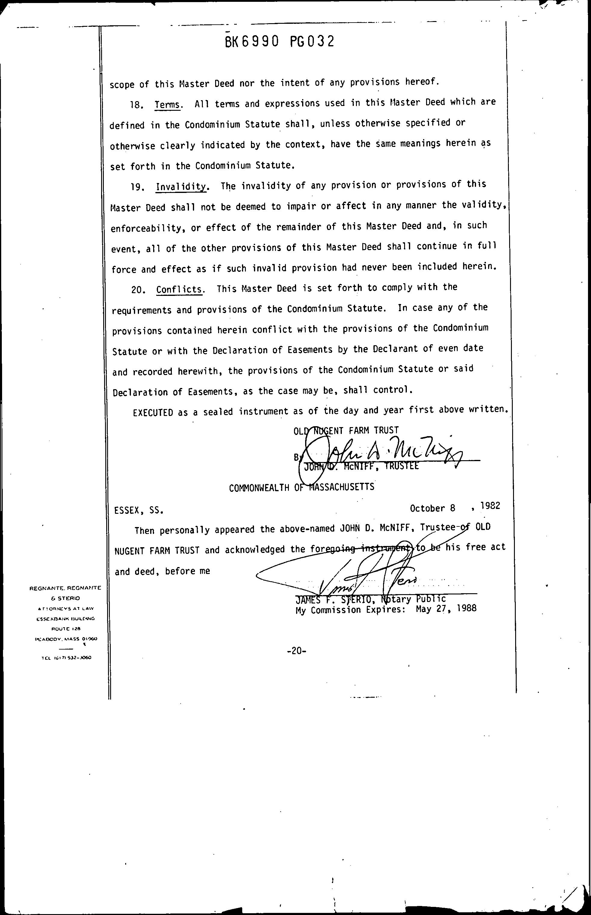 This MASTER DEED of the OLD NUGENT FARM CONDOMINIUM, made as of the 8th 1982. day of October amend. B.7008 P.745 amd B.7231 .23 amd 7341 Pisien