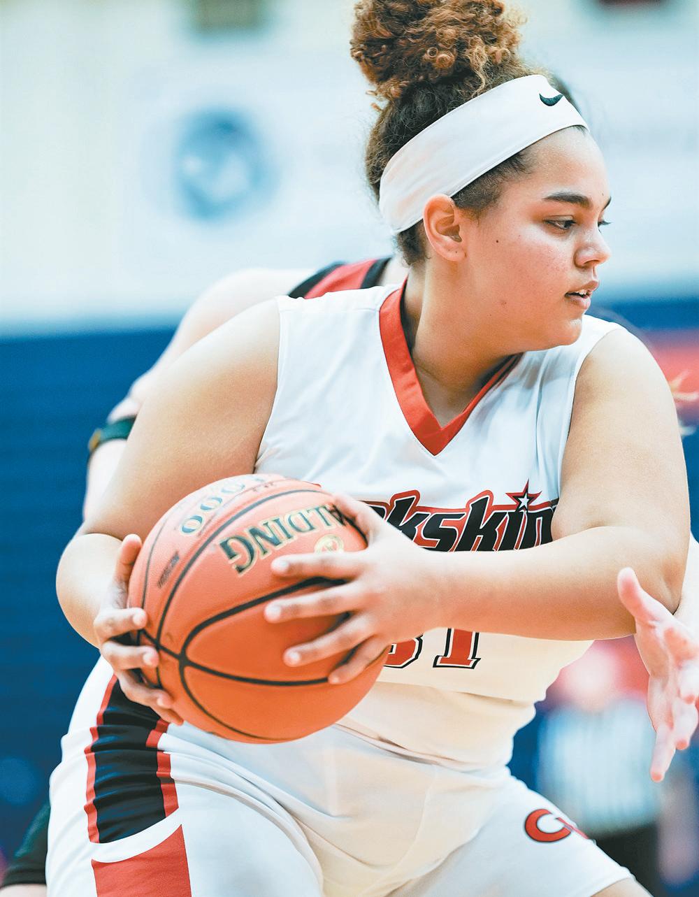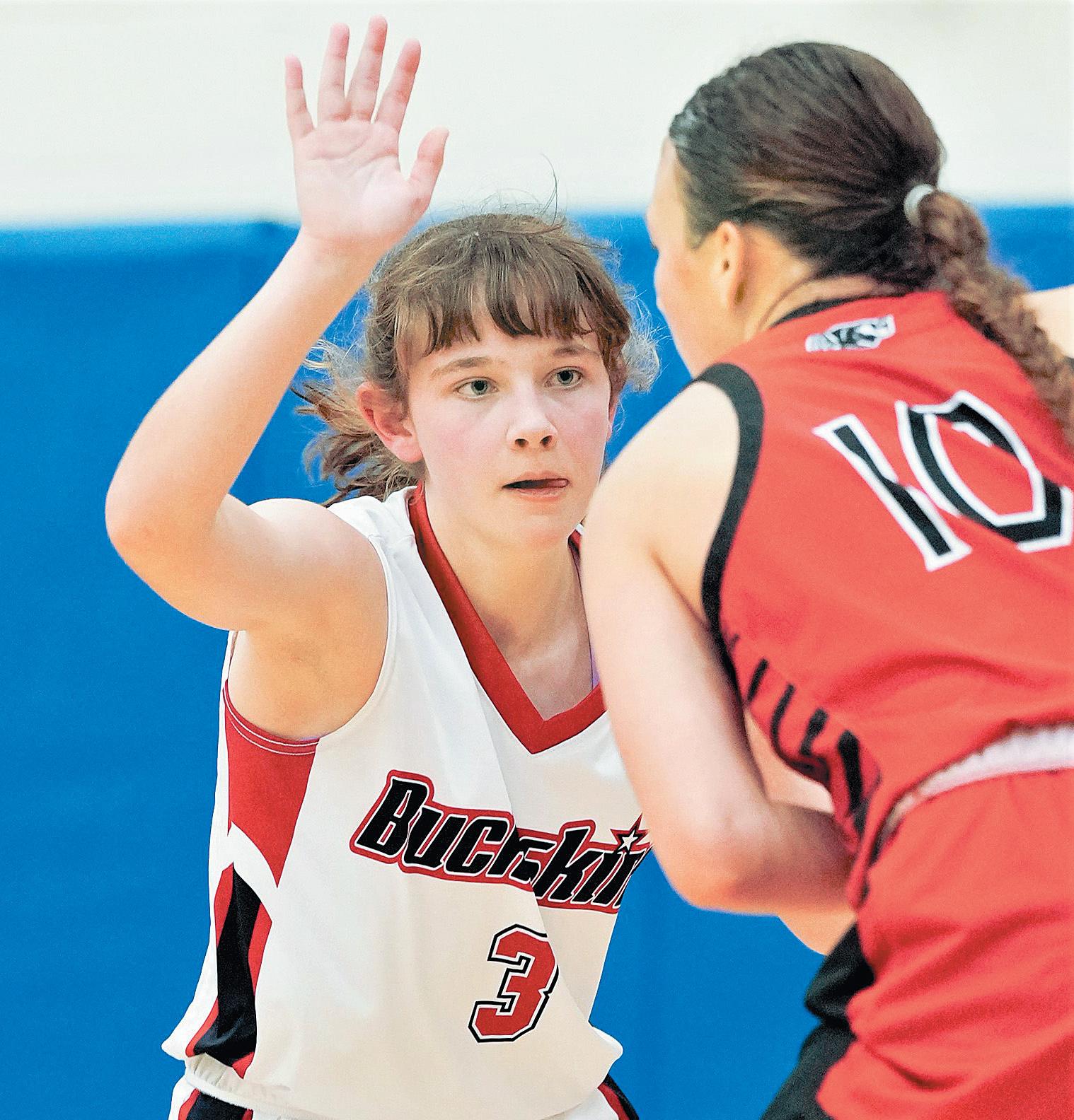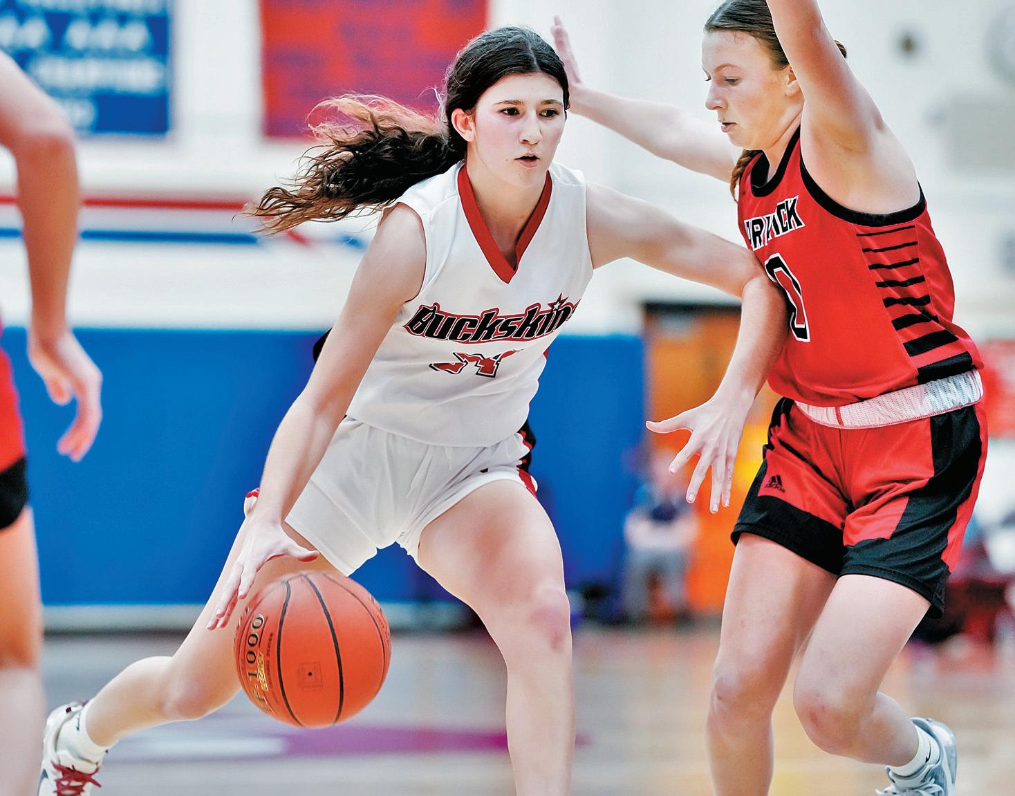 Rhiannon Henry fends off Warwick defender Olivia Fleurant as she pushes the ball upcourt for the Buckskins in their 45-44, double-overtime loss at CV on January 6.
