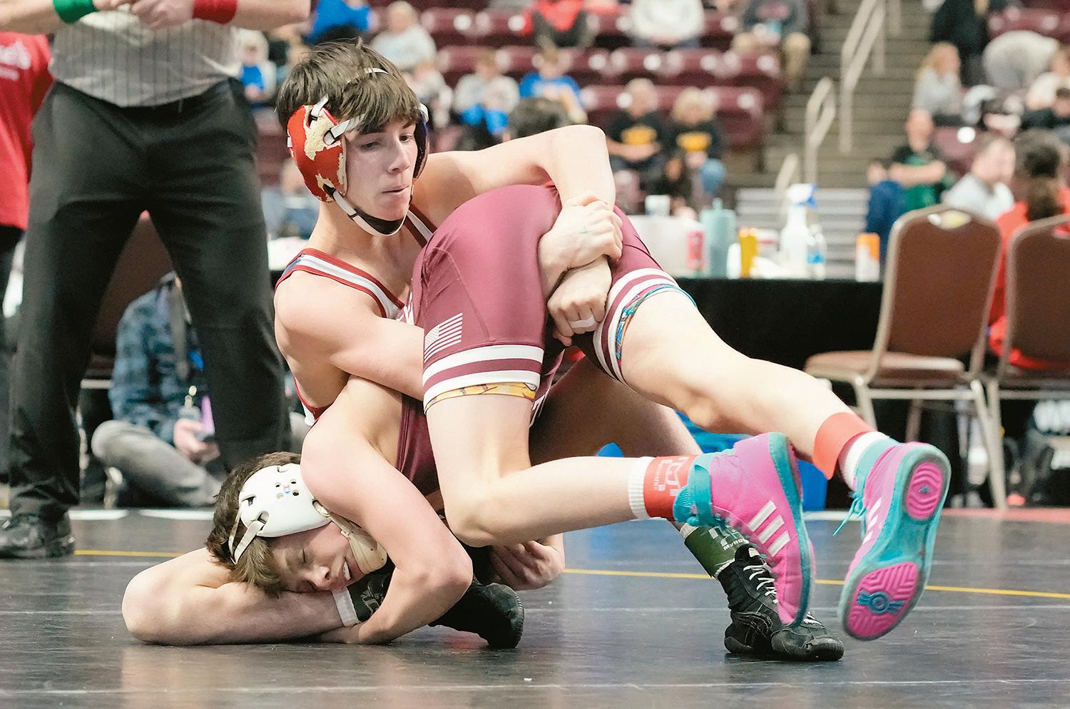 the Buckskins’ Sean Morley (107) tries to wrap up Altoona’s Dominic Picciotti during the PIAA 3A State Championships held at the Giant