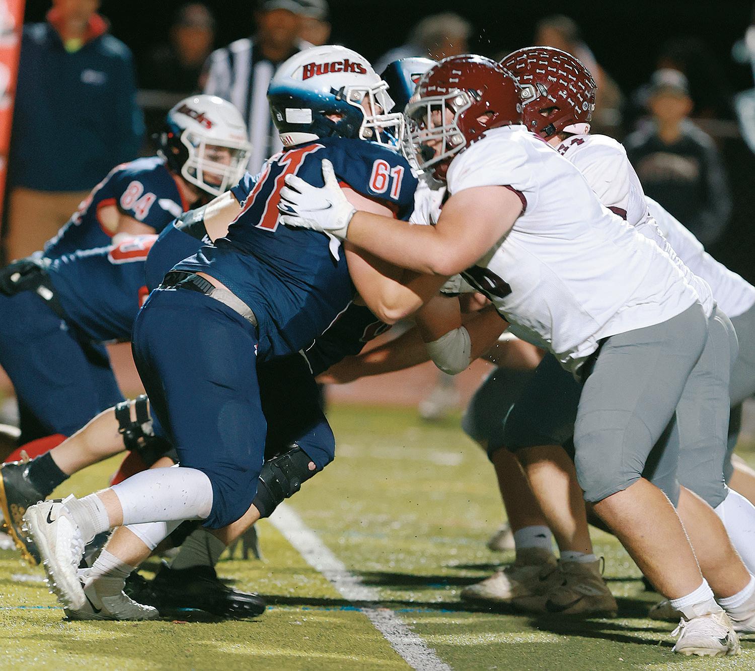 On Friday, November 8 in Witmer, Bucks’ Tal Stoltzfus battles a Shippensburg lineman during the PIAA District III Class 5A football quarterfinals in Witmer. Conestoga Valley won 35-24.