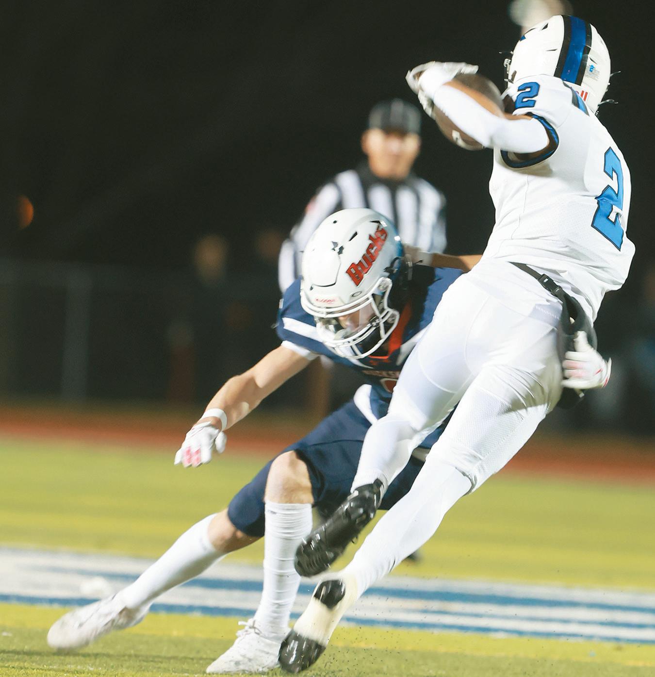 Buckskins’ Teagan Ruble jukes to the right of an Exeter defender in a heart breaking 48-14 loss during the PIAA District III Class 5A semifinal on Friday, November 15 in Witmer. Ruble caught a 44-yard pass for a touchdown and had 54-yards rushing.