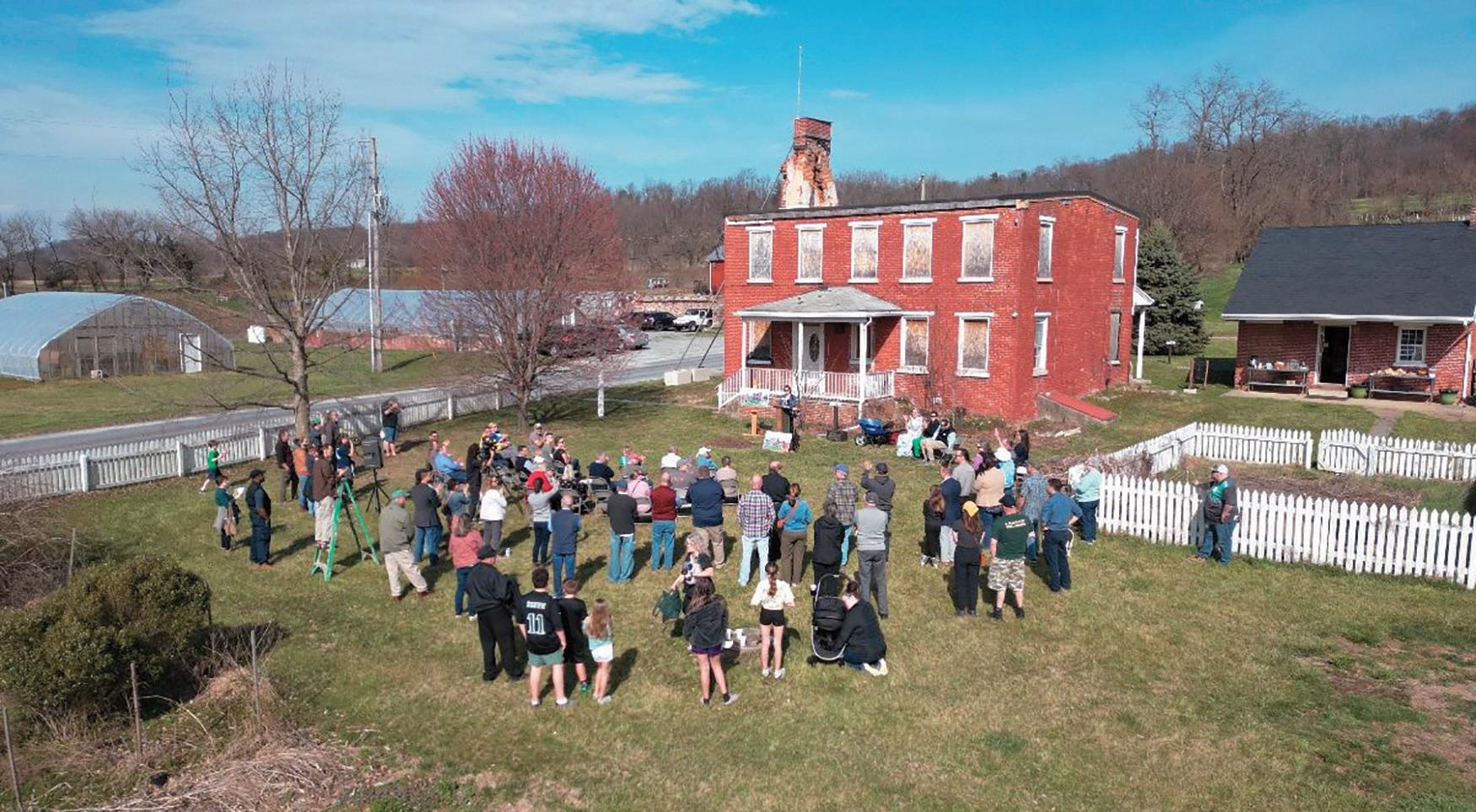 A drone shot of the groundbreaking ceremony at the Horn Farm Center