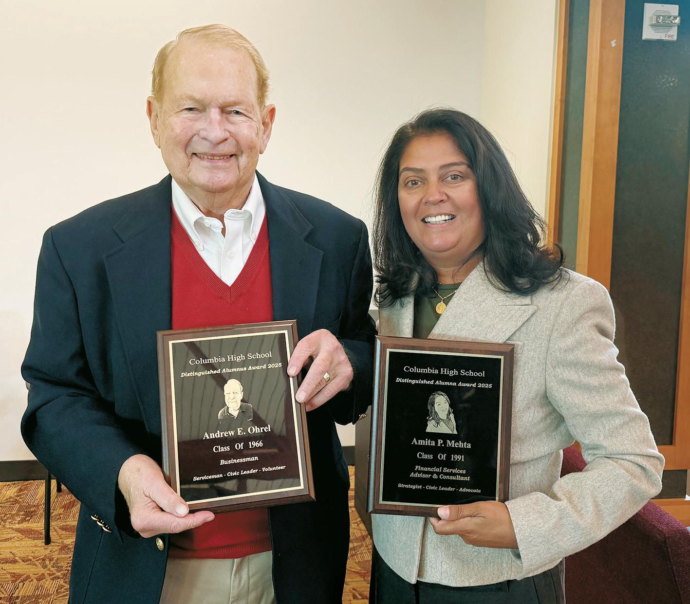 Amita Mehta, Columbia Class of 1991, and Andrew (Andy) Ohrel, Columbia Class of 1966, were awarded this year’s honors at the event held in the library of Columbia High School in early October.