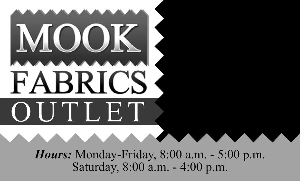 R091193 Valid ONLY on Sat. Feb. 25, 2023 Must present coupon at time of purchase. Limit one per customer. C2023222 Expires 3/8/23 Must present coupon at time of purchase. Limit one per customer C2023222 $12.99 PROPANE REFILL 20 LB. CLIP AND SAVE! $5.00 OFF ANY PURCHASE OF $45.00 OR MORE Expires 3/8/23 Must present coupon at time of purchase. Limit one per customer C2023222 Valid ONLY on Sat. Mar. 4, 2023 Must present coupon at time of purchase. Limit one per customer. C2023222 $5 OFF ALL PAINT FREE PER GALLON LIMIT 5 PER CUSTOMER SEPTEMBER FARM SANDWICH TICKE M KET WITH $50 PURCHASE L R092590 HUGE SELECTION OF FABRIC! Over 10,000 Bolts! Dress, Quilting, Tapestry, Tapestry Flannel, Fleece, Home Decor, , Sewing Notions & Lots More! Hours: Mon.-Thurs. 8am-5pm; Fri. 8am-7pm & Sat. 8am-4pm 247 W. Main St., Leola, PA 17540 • 717-556-8546 R091739 GIFT CERTIFICAT ES! TES! S hipping Available Shipping Av Drawing for Mook Gift Certificate (daily) for Mook Gift Certificat February 20-25 10% OFF STOREWIDE 50% OFF DOTTED/RED TAGGED ITEMS 6 BIG DAYS ONLY! (Feb. 20, 21, 22, 23, 24 & 25)