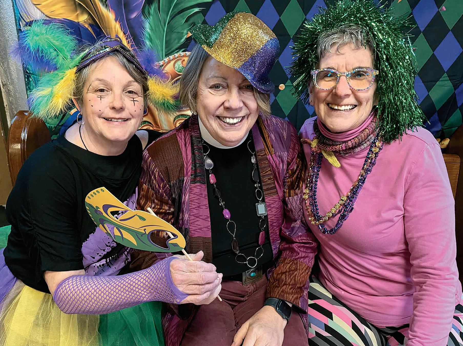 Inviting people to a Mardi Gras meal at Saint Luke Episcopal Church are (from left) Lynn McCleary, the Rev. Martha Harris and Kim Morrow.