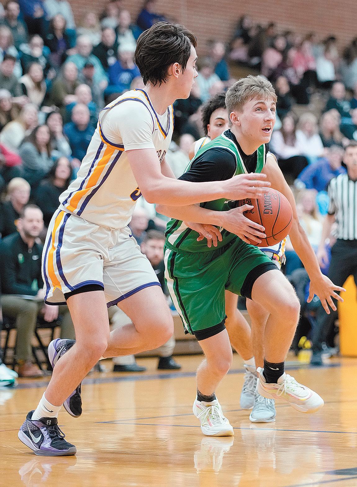Sawyer Floyd muscles his way up the floor for the Indians against Ephrata’s Grayson Shellhammer, during a 56-45 loss in non-section play on Thursday, February 6.