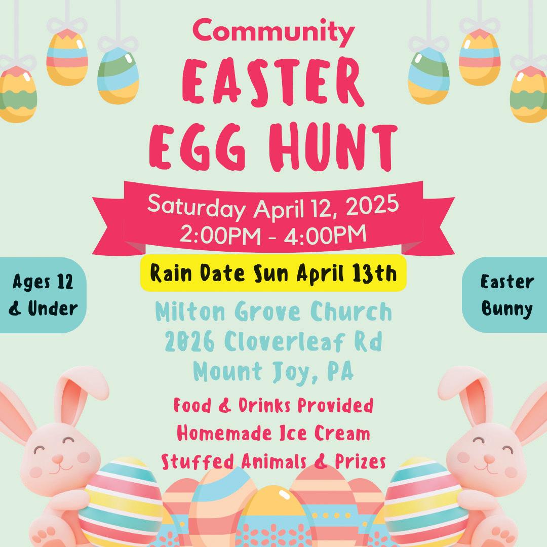 MILTON GROVE CHURCH: 2026 Cloverleaf Road (located N. of Rt. 283 Rheems/ Elizabethtown Exit) Mount Joy. Pastor: Jamie Pietsch. Join us Sundays at 9:30 am for in-person worship and on Facebook live at www.miltongrovechurch.com