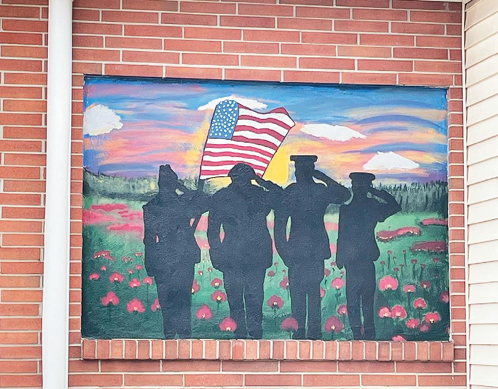 The mural depicts silhouettes of soldiers with a sunset and a poppy field in the background. “In high school, I was in choir all four years, and the song ‘In Flanders Fields’ was a big inspiration for the piece,” Sarah said. “I knew I wanted to include poppies.”