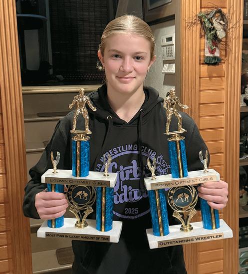 Ivy, the daughter of John and Tracy Carl of Elizabethtown, is the first person in the 51-year history of the Elizabethtown Optimist Junior High Tournament wrestling tournament to win her weight class back-to-back years and also earn fastest pin honors. Additionally, she took home Outstanding Wrestler, an honor voted on by other coaches and teams.