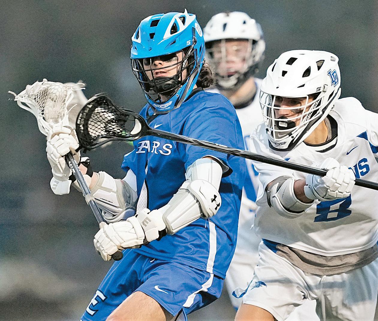 E-town’s Elijah Poulos looks to get a shot off against Lower Dauphin’s Ian Sharp during the Bears’ 8-7, nonleague loss to the host Falcons on March 31.