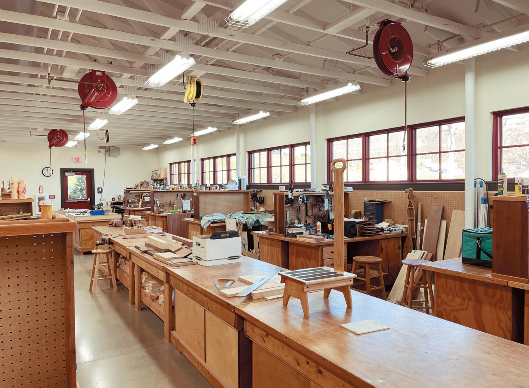 1991, the shop relocated to a renovated chicken house, and in 2016, it moved to its current 8,700-squarefoot building, funded primarily by resident Robert Umbaugh. The facility features workstations for each member; various equipment, including band saws, lathes, radial arm saws, sanders and joiners; a finishing room, complete with a spray booth;