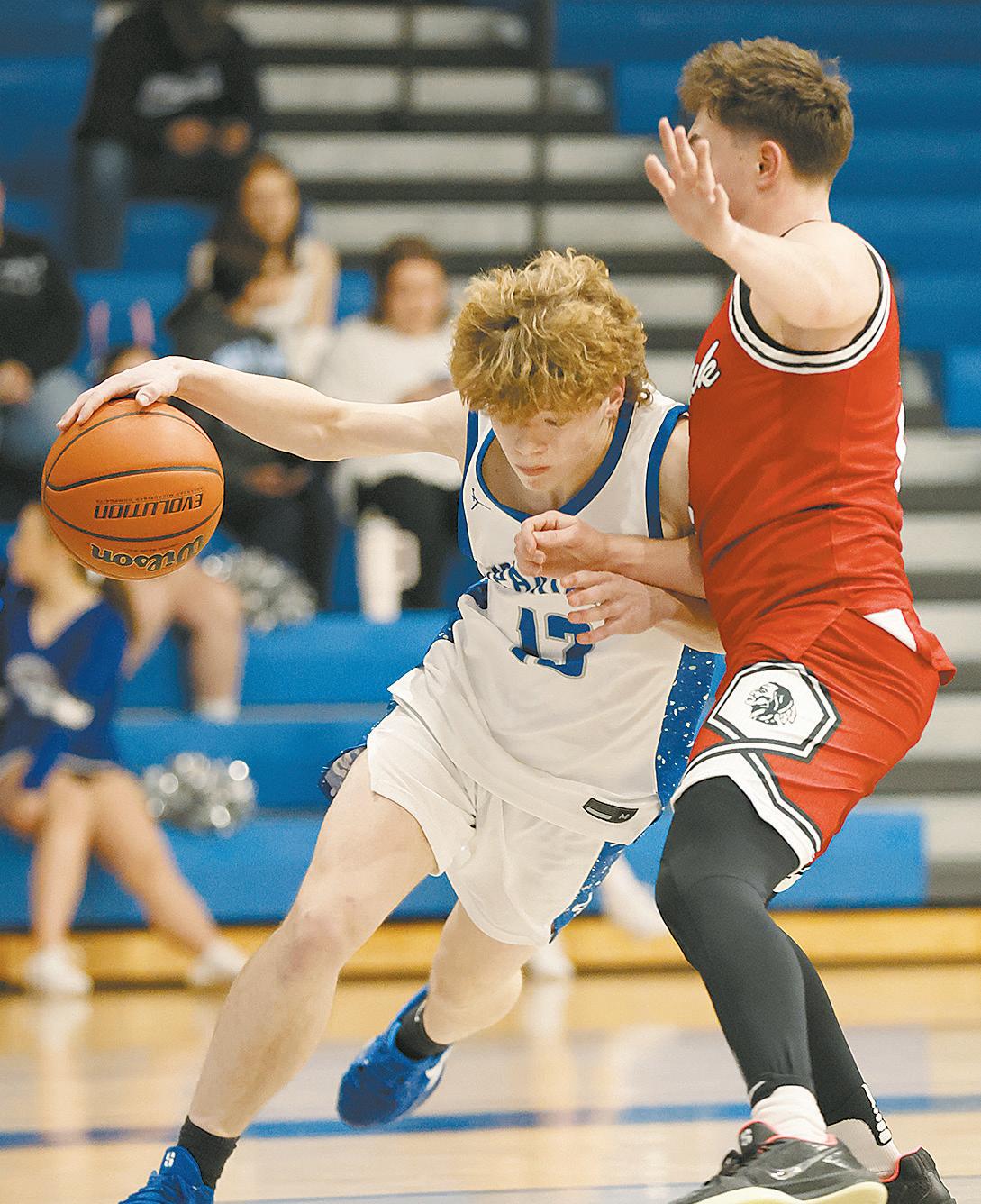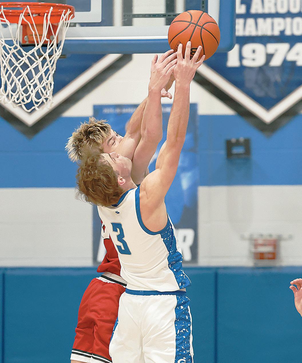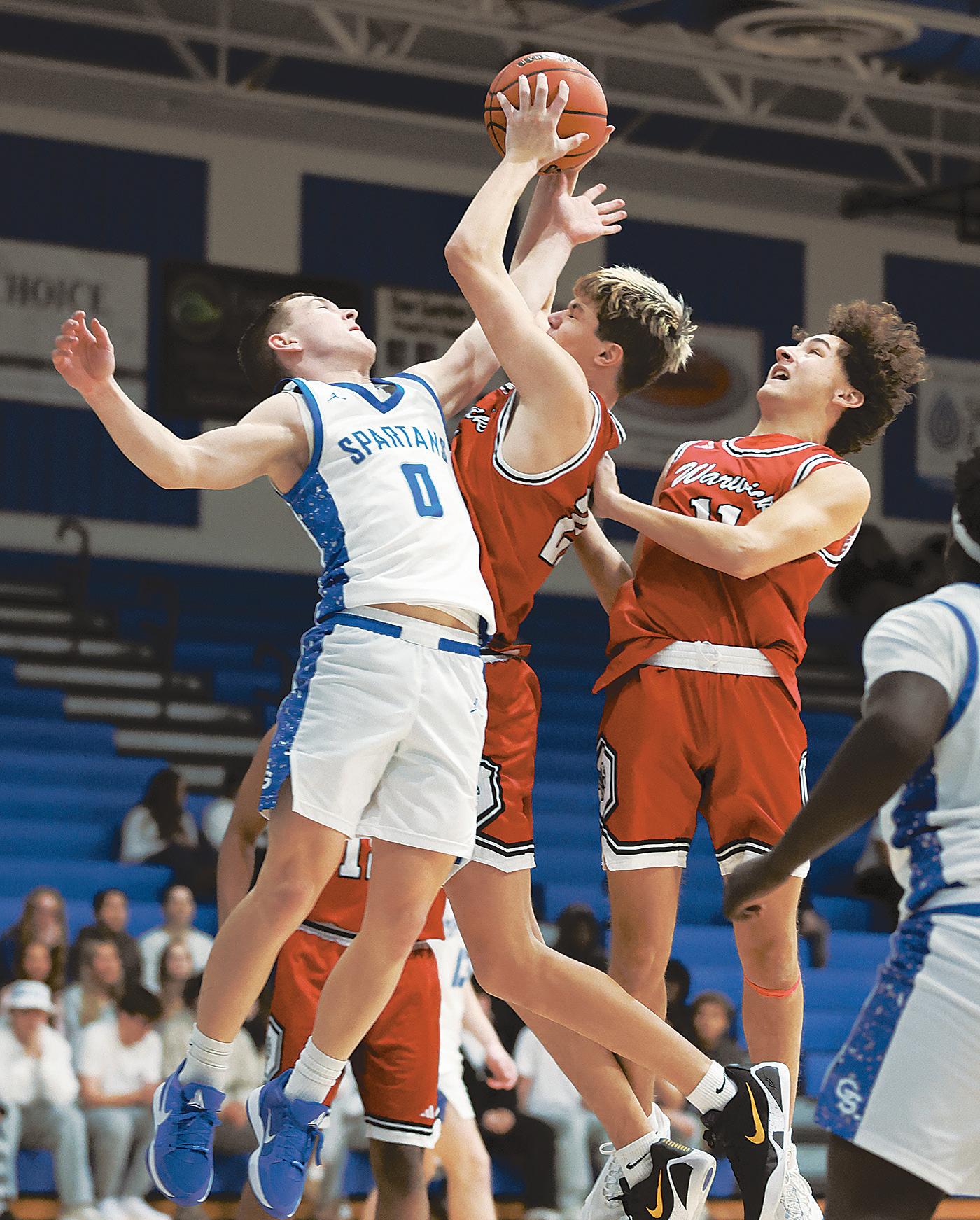 On Wednesday, February 4, Spot’s Seth Musselman goes up for the rebound against Warwick’s Tyler Musser during a 65-53 loss.