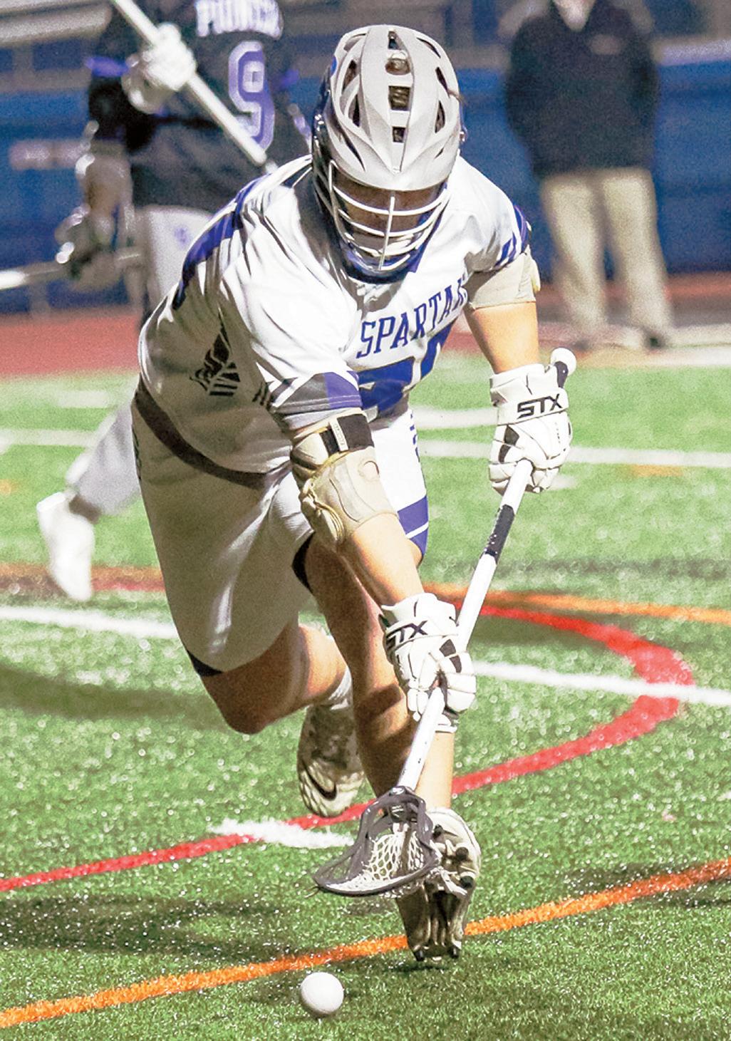 Spartan’s Cullen Witmer scoops up the ball during a 12-4 loss on Monday, March 24, at home against LampeterStrasburg.