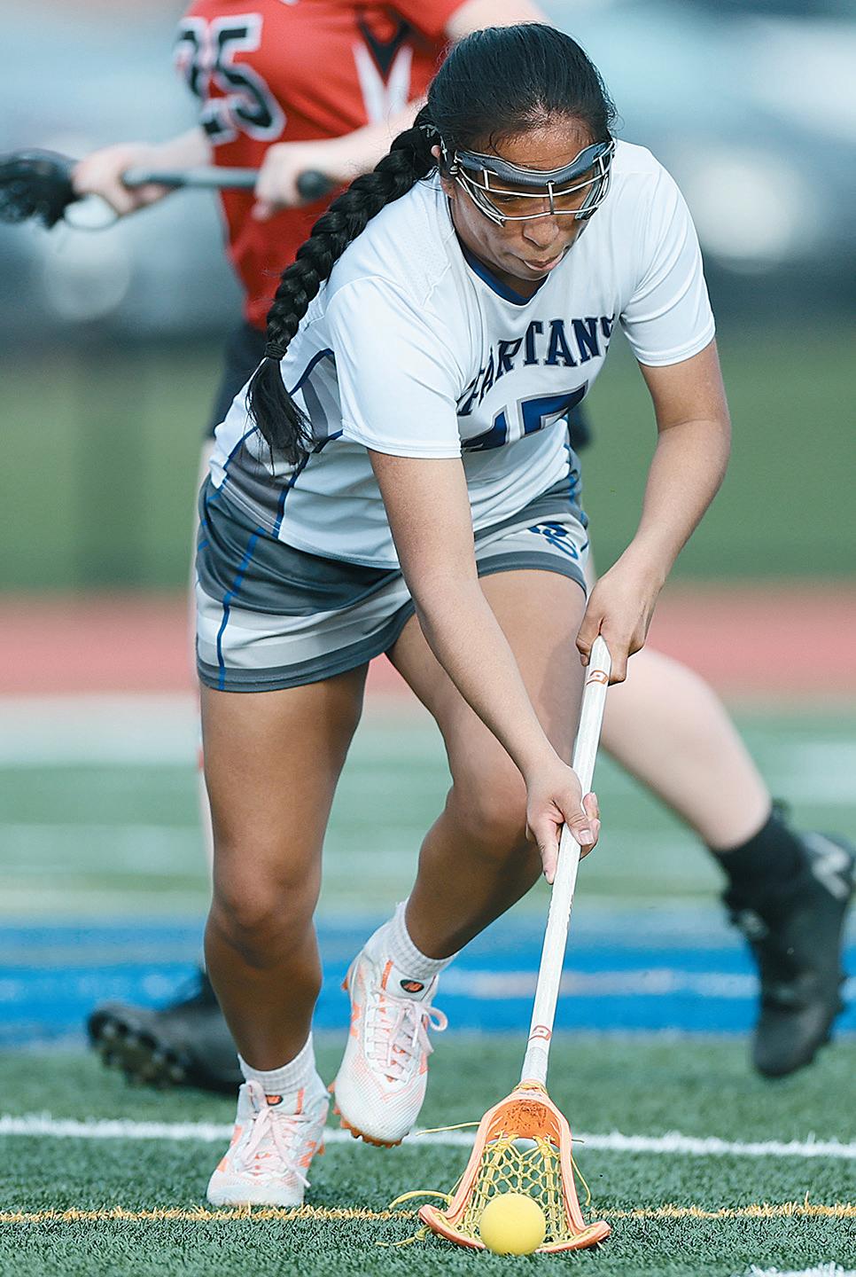 Spartans’ Freida Kauffman scoops up the ball against visiting Warwick during a 13-7 win on Thursday, April 3.