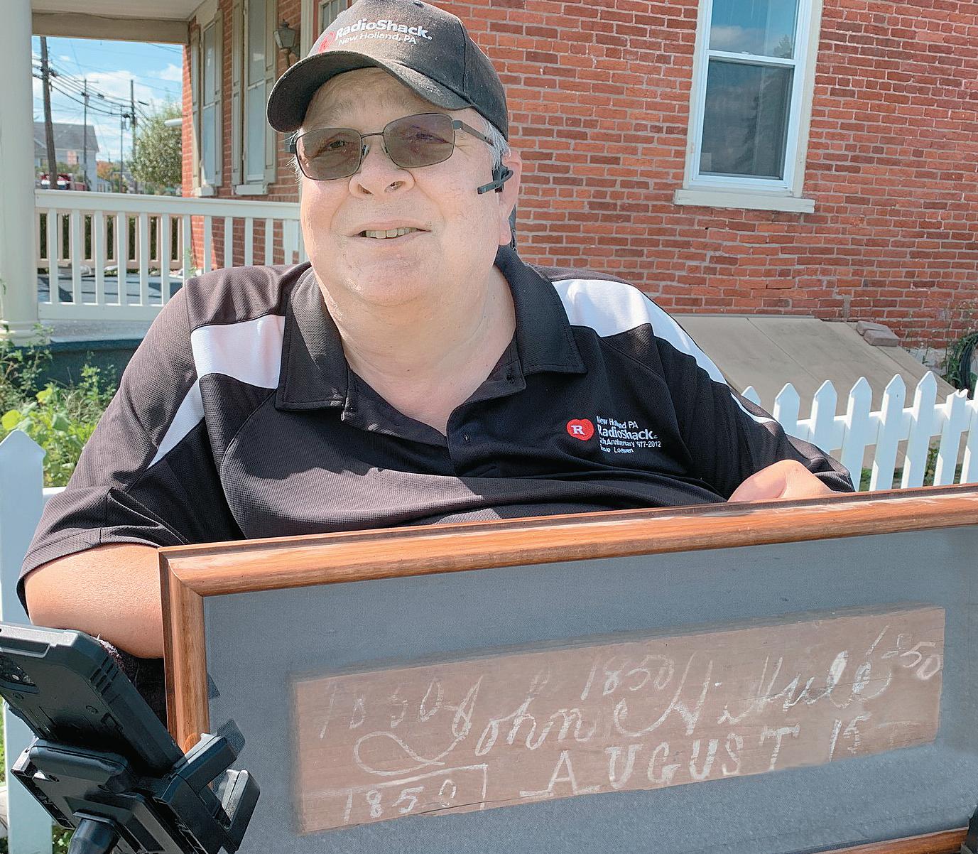Steve Loewen holds a board bearing the name of John H. Hull from 1850. Loewen found the board in the house he remodeled at 331 E. Main St., New Holland, which was formerly the Trinity Lutheran Church manse.